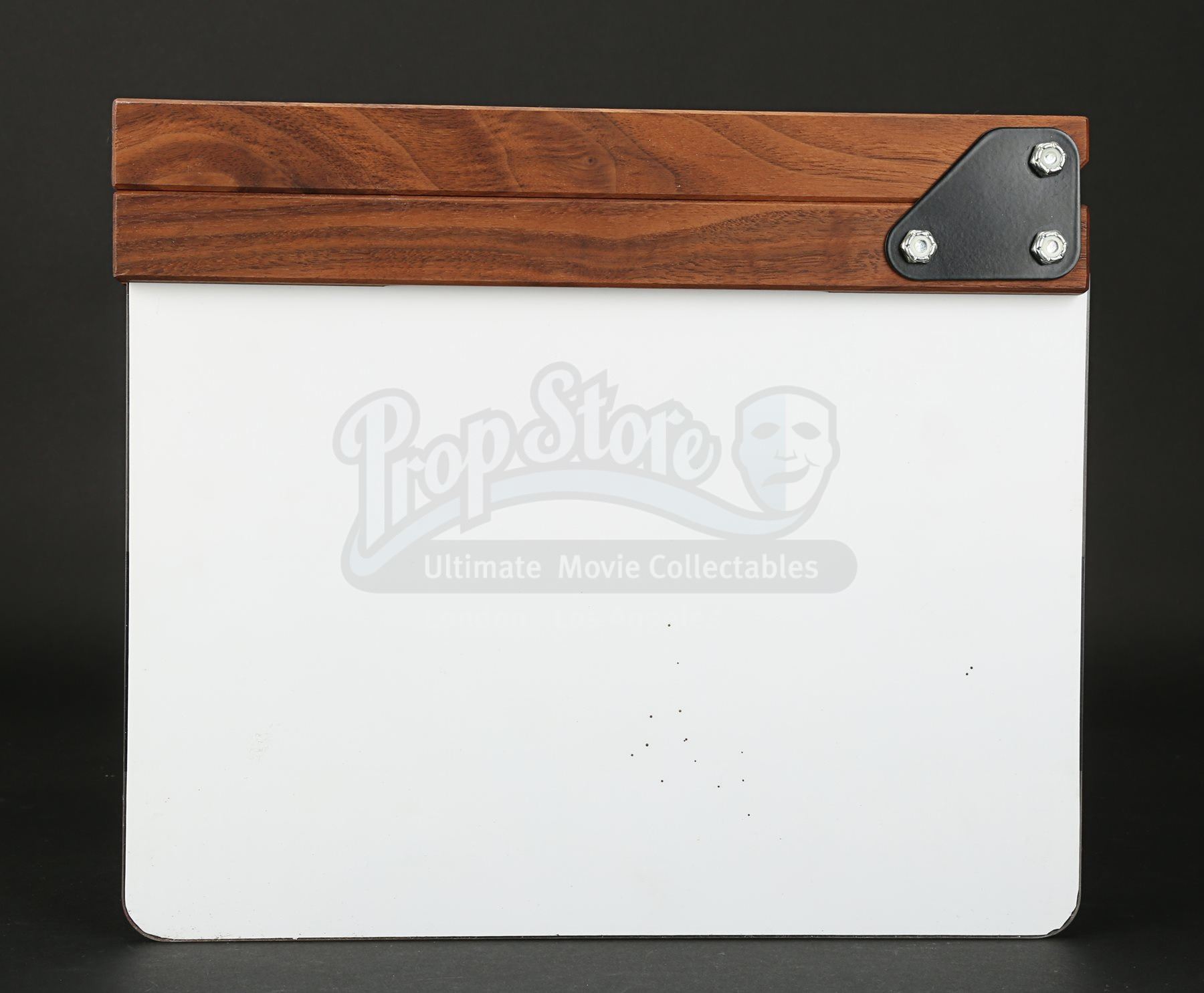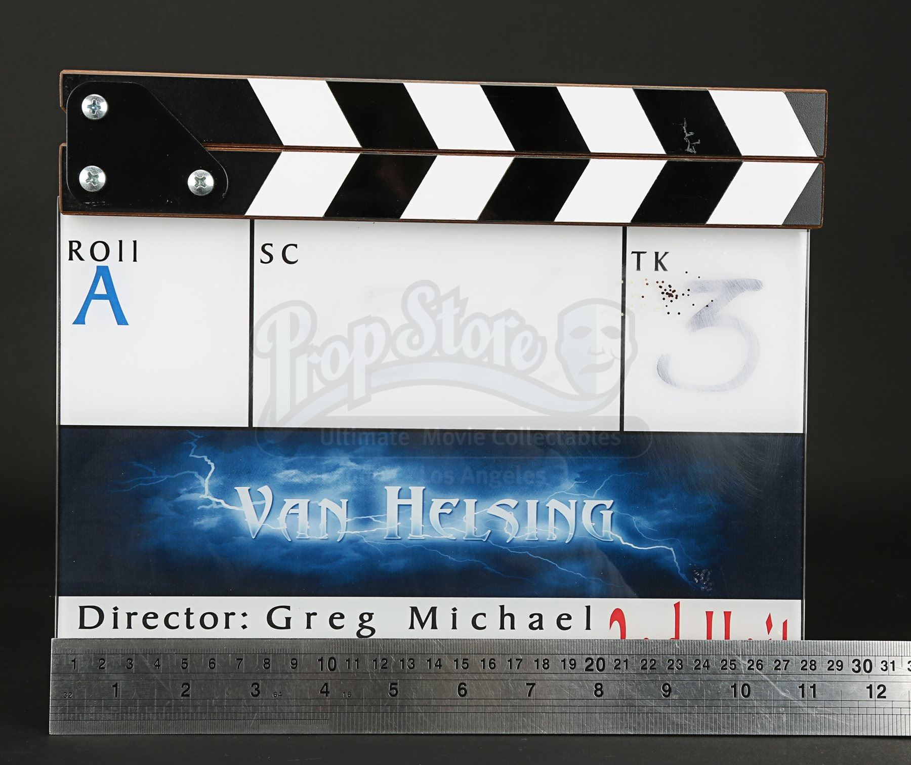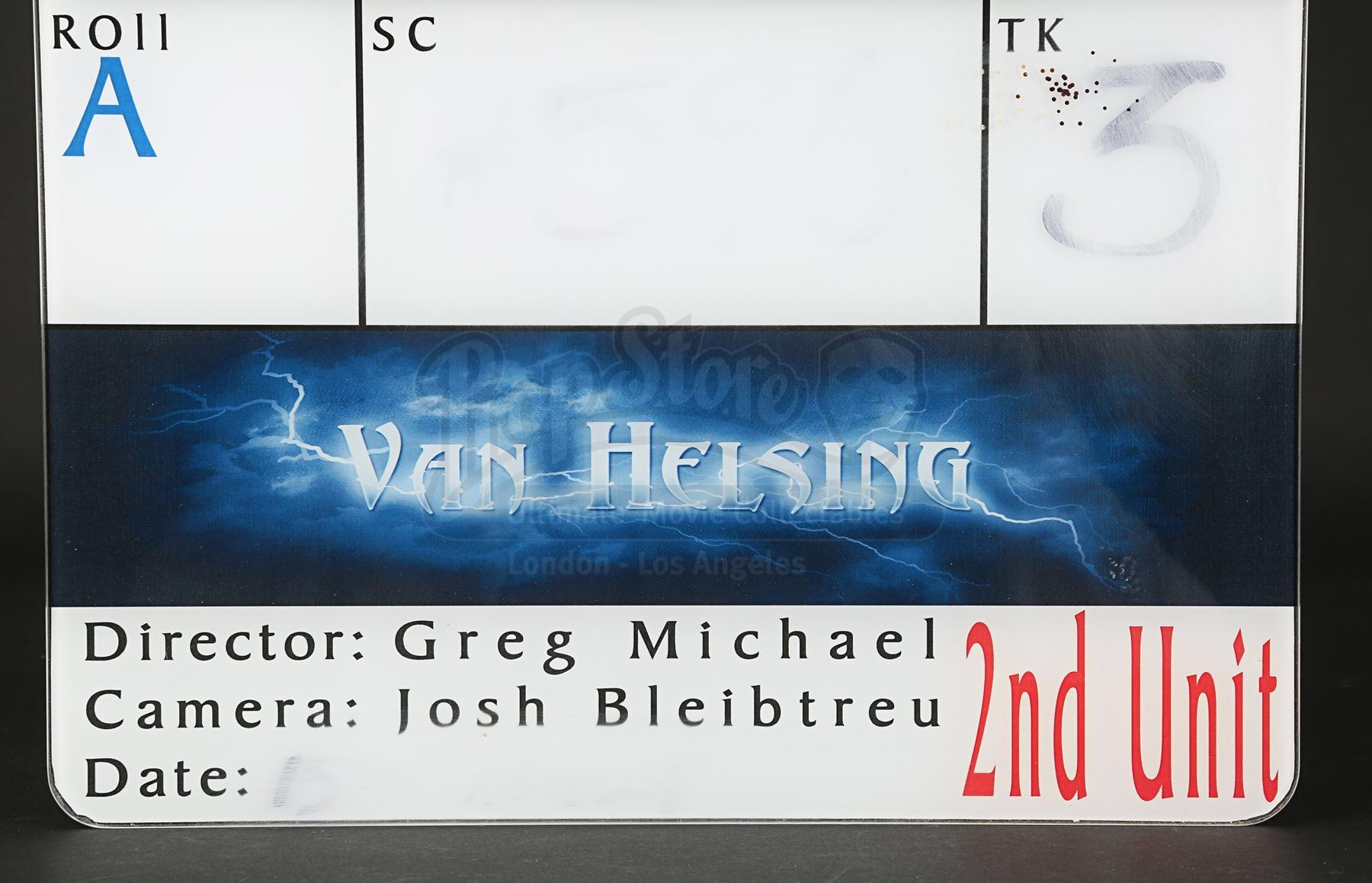 A 2nd unit clapperboard crew gift from Stephen Sommers’ fantasy adventure film Van Helsing. The clapperboard consists of an acrylic slate with a wooden clapper. The slate is backed with vinyl, on which are printed boxes for information, including roll, scene, date and take. The movie title is incorporated into a lightning-themed banner above the second unit director “Greg Michael”, camera “Josh Bleibtreu” and “2nd Unit” in red. Unused during production, the slate has some ink residue from where fields were filled in for aesthetic purposes. Dimensions: 3 cm x 28 cm x 24 cm (1 ¼” x 11” x 9 ½”)