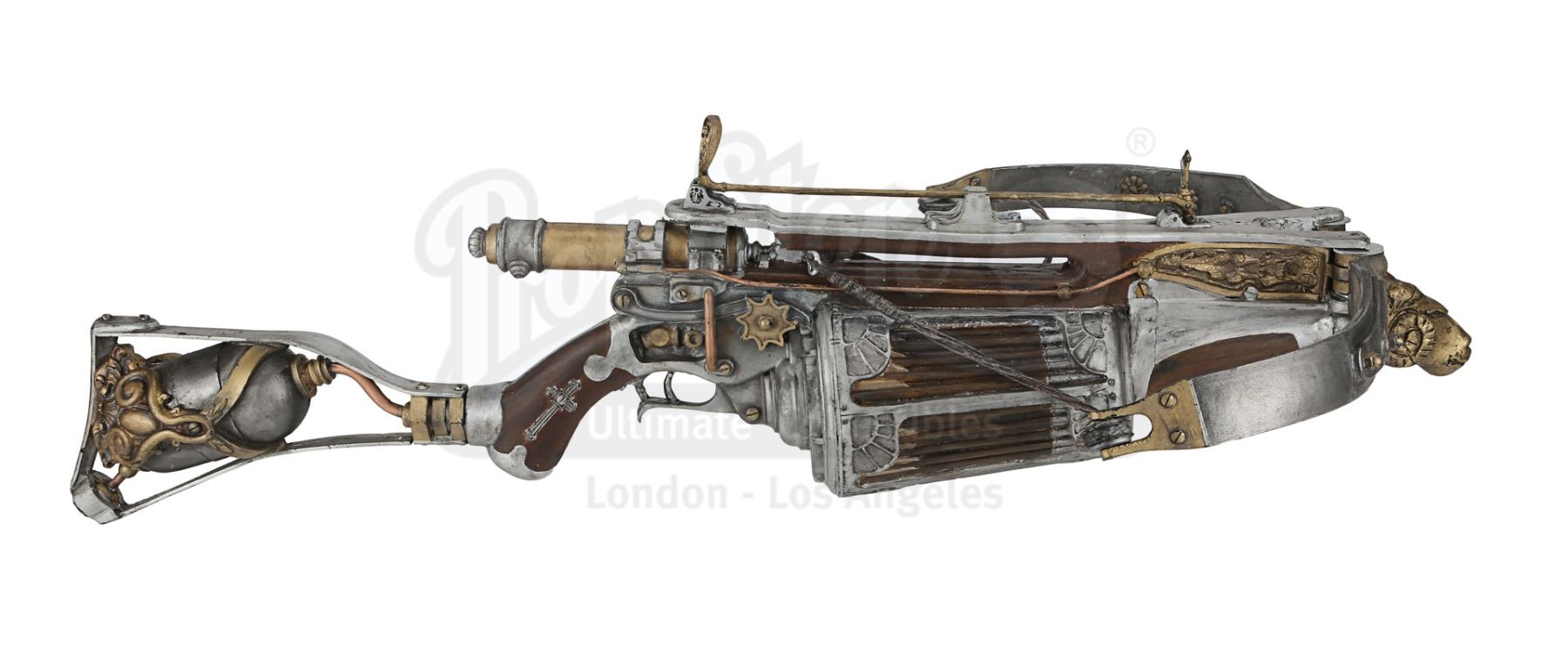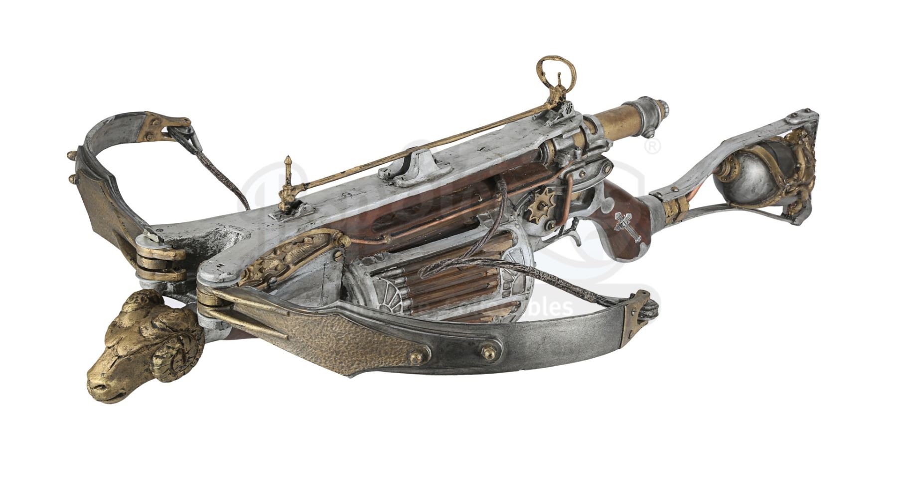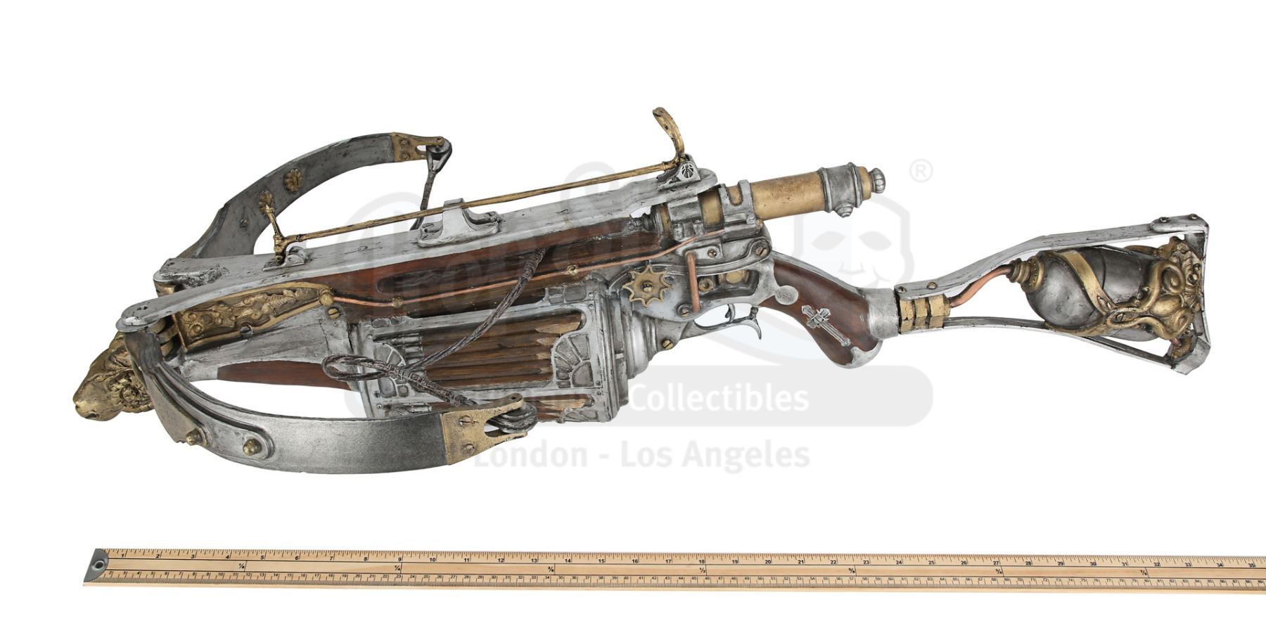 Van Helsing's (Hugh Jackman) stunt crossbow from Stephen Sommers' fantasy-adventure film Van Helsing. Van Helsing was given his gas-powered automatic crossbow by its inventor, Friar Carl (David Wenham), and used it in his battle with the brides of Dracula (Richard Roxburgh), killing the vampire Marishka (Josie Maran) after dipping its arrows in holy water. Stunt versions were used during action sequences, to avoid damaging to the functioning hero weapon.