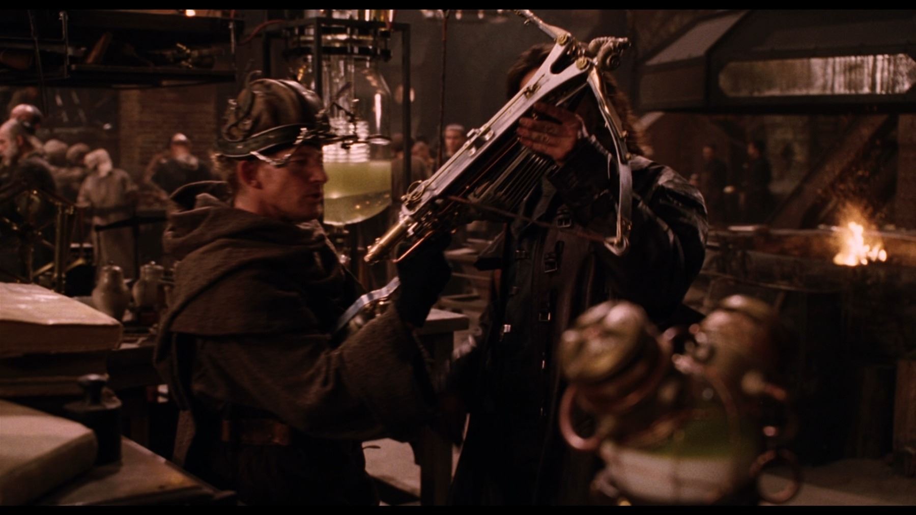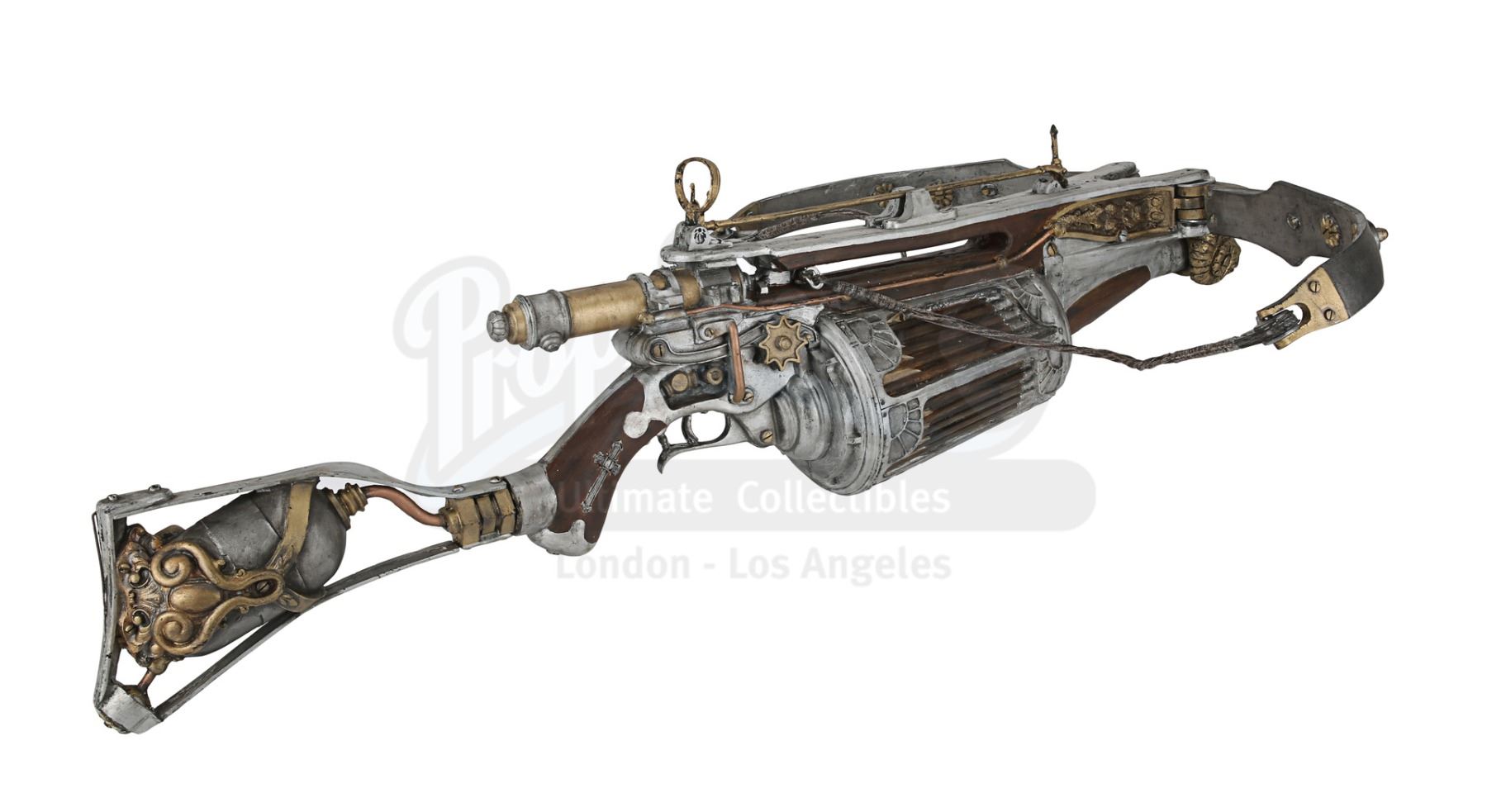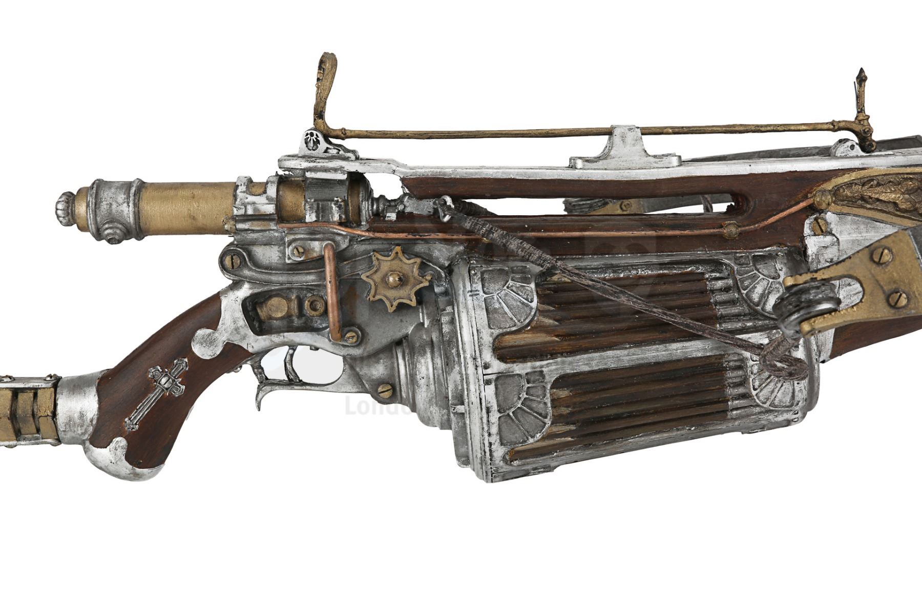 Van Helsing's (Hugh Jackman) stunt crossbow from Stephen Sommers' fantasy-adventure film Van Helsing. Van Helsing was given his gas-powered automatic crossbow by its inventor, Friar Carl (David Wenham), and used it in his battle with the brides of Dracula (Richard Roxburgh), killing the vampire Marishka (Josie Maran) after dipping its arrows in holy water. Stunt versions were used during action sequences, to avoid damaging to the functioning hero weapon.