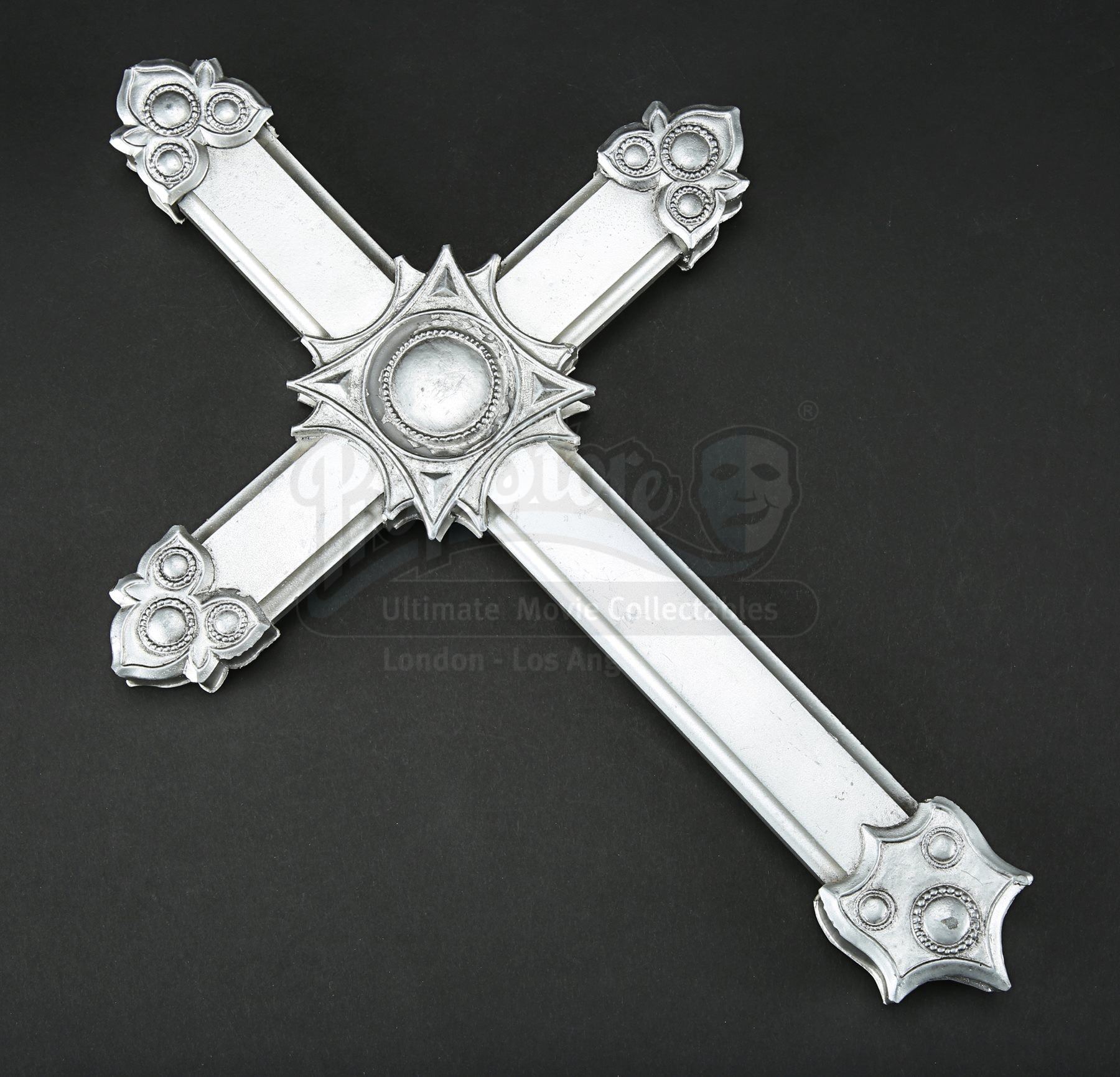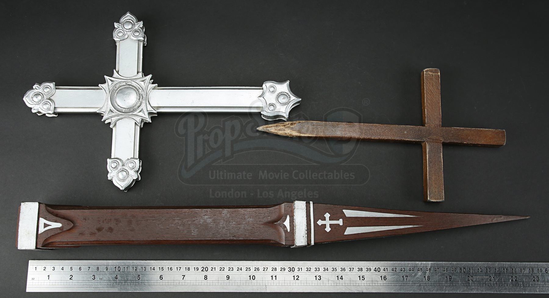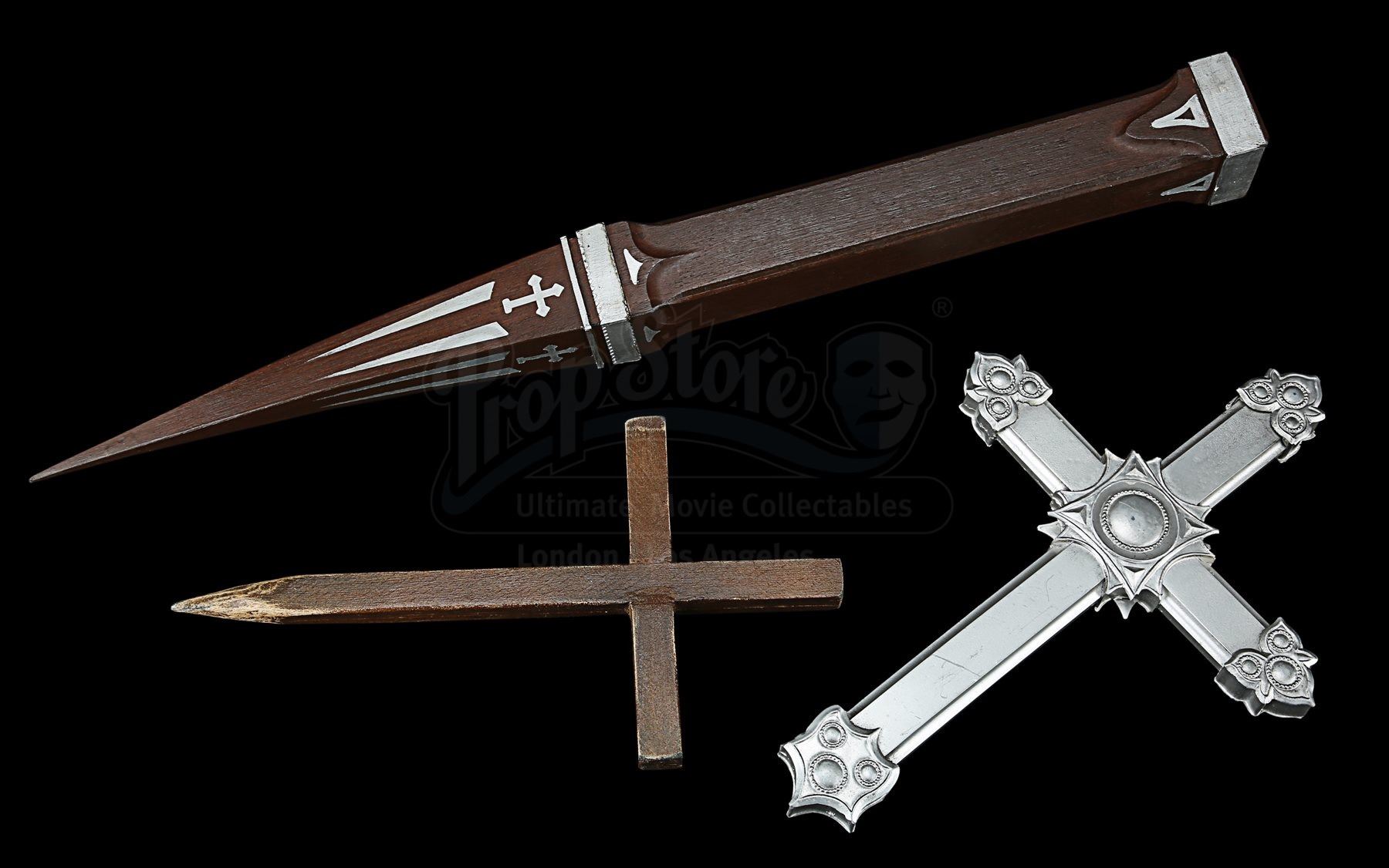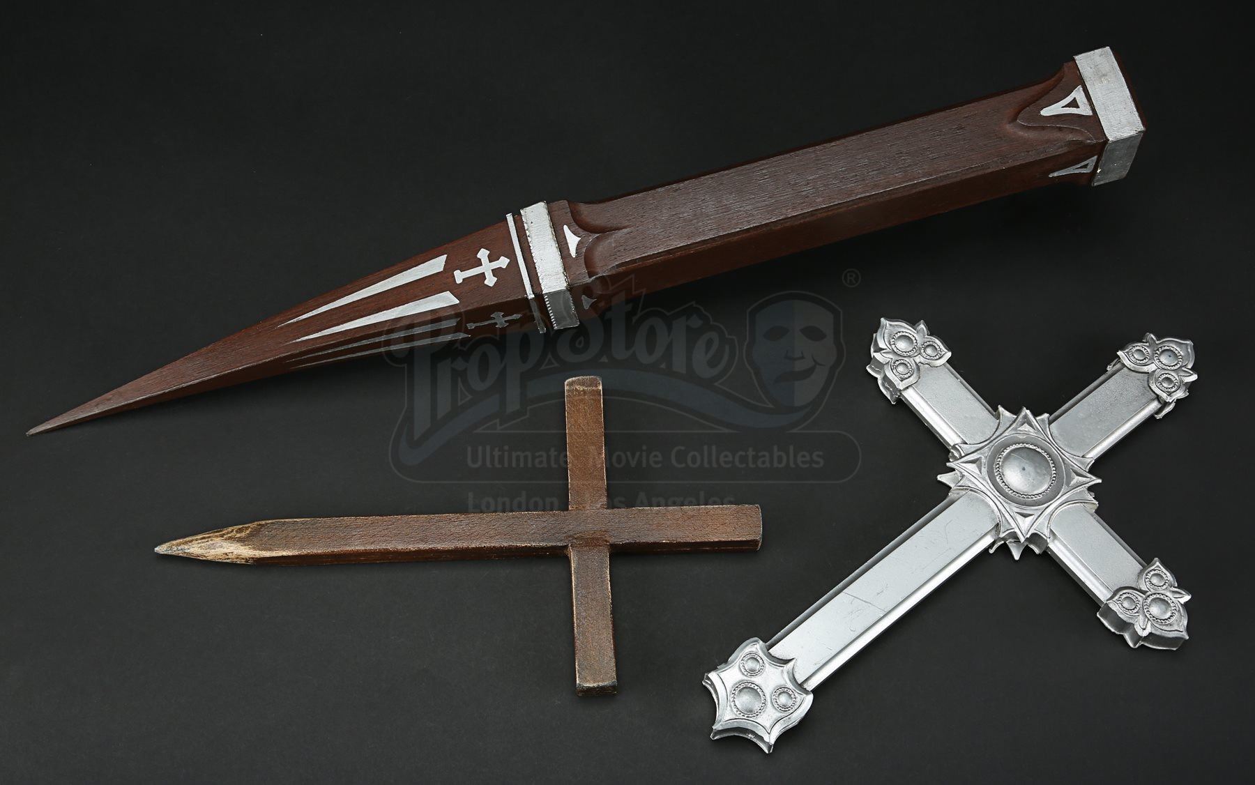 A collection of crucifixes and a stake from Stephen Sommers’ fantasy-adventure film Van Helsing. The Vatican Secret Order armoury was well stocked with vampire-hunting devices while Van Helsing (Hugh Jackman) briefed Friar Carl (David Wenham) on their mission there, before taking a variety with them to Transylvania.