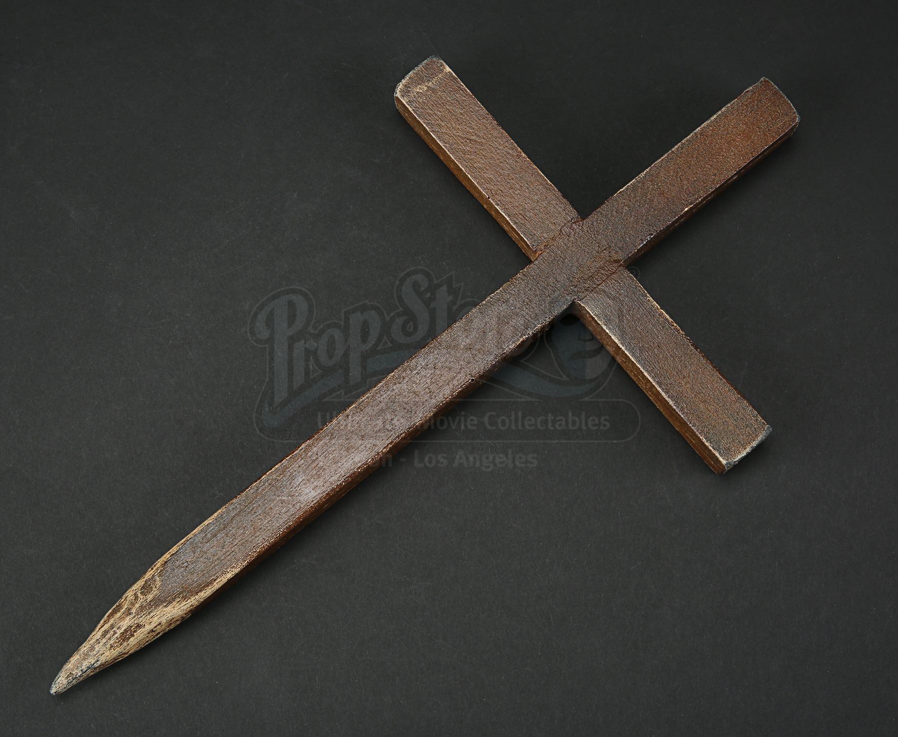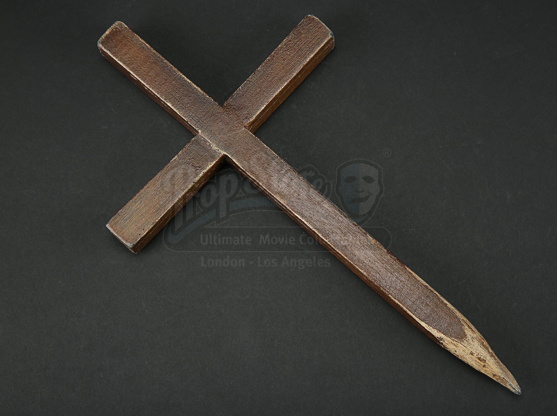 The set consists of a rubber crucifix stake, decorated to resemble wood; a crucifix cast from resin and painted faux silver; and a long stake made of solid rubber, painted to look like wood with embellishments in faux silver. Each remains in good condition, with a slight curve to the stake. Dimensions (largest): 58cm x 5 cm x 5 cm (22 ¾” x 2” x 2”)