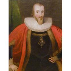 VAN SOMER (MANNER), portrait of a Jacobean dignitary wearing a ruff, and red furred robe, George of the Garter, small half length, oils on canvas, 19th Century, 50cm x 43cm £150-180