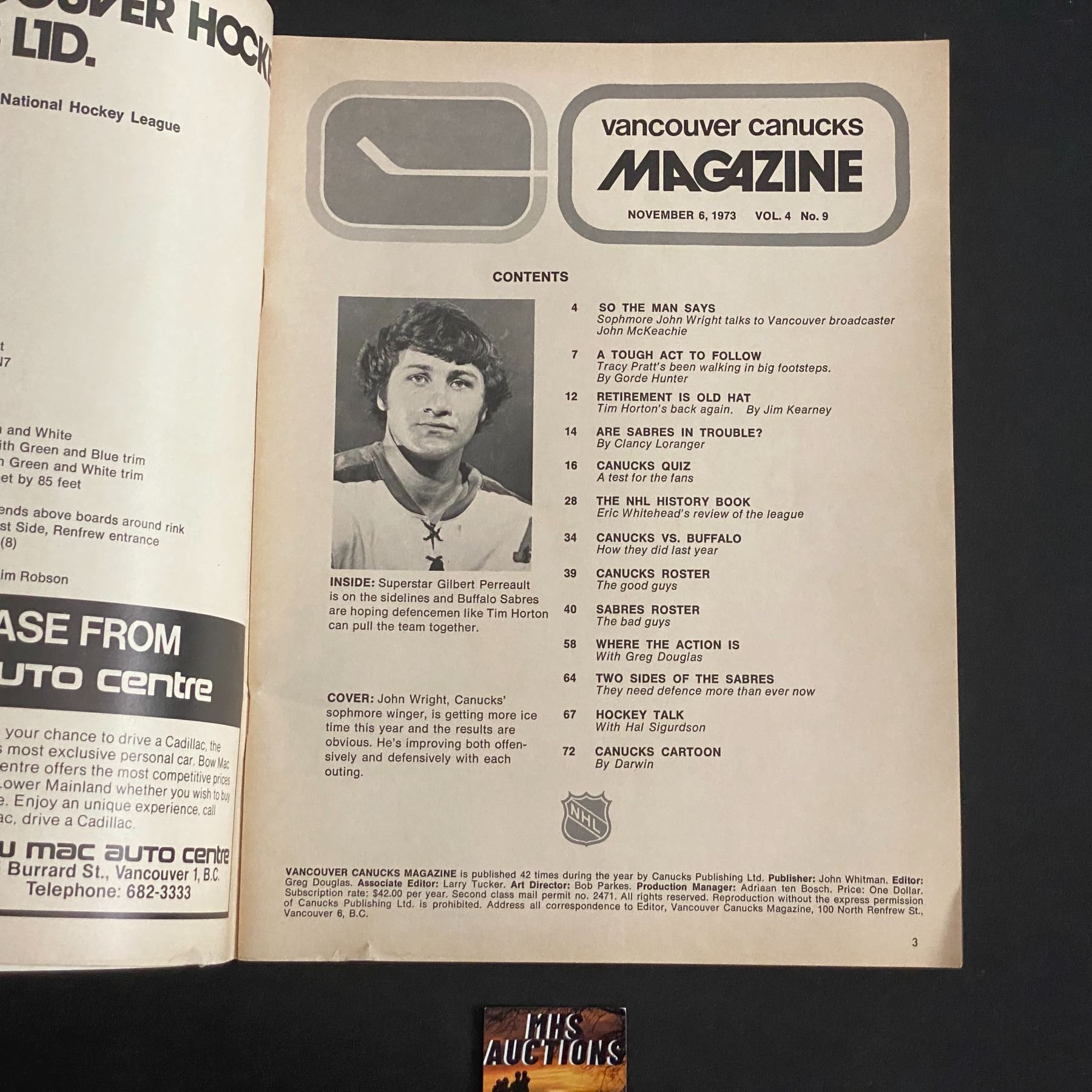 VANCOUVER CANUCKS PROGRAM FROM NOVEMBER 6, 1973