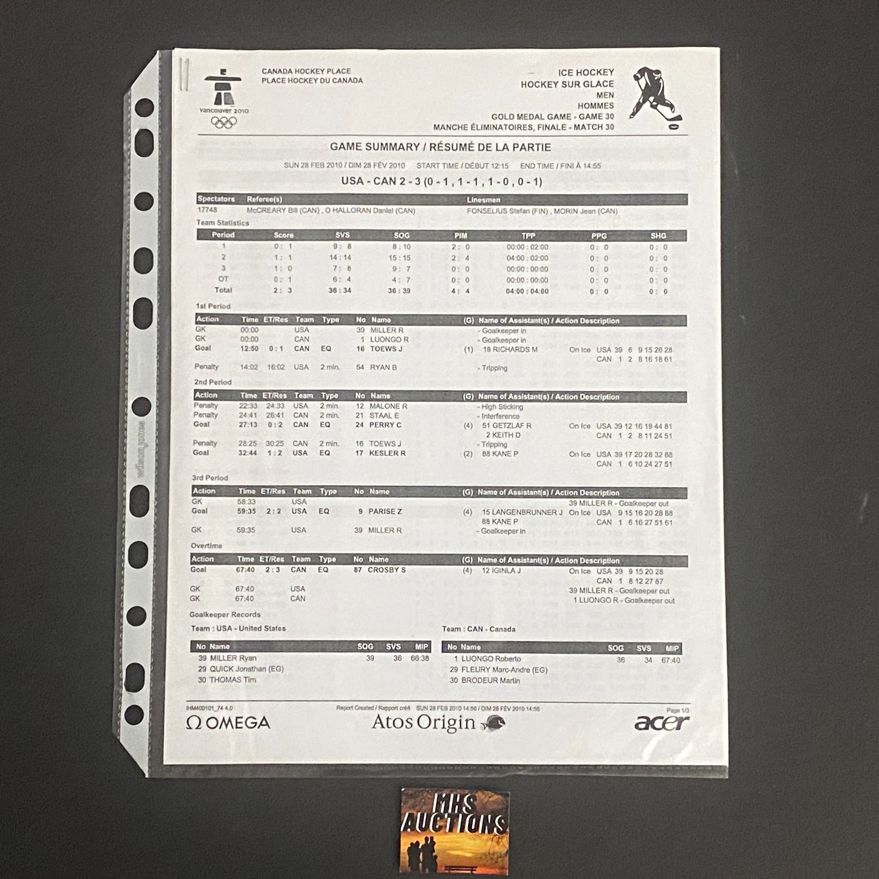 VANCOUVER OLYMPICS 2010 RARE GAME SUMMARY SHEET FROM THE MENS GOLD MEDAL GAME