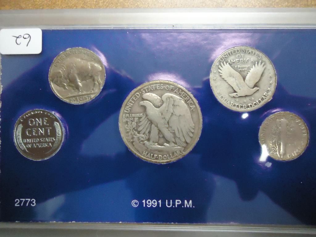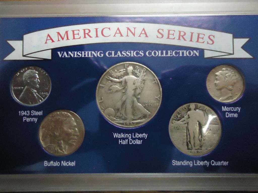 BUFFALO NICKEL, MERCURY DIME, STANDING LIBERTY QUARTER AND WALKING LIBERTY HALF DOLLAR.