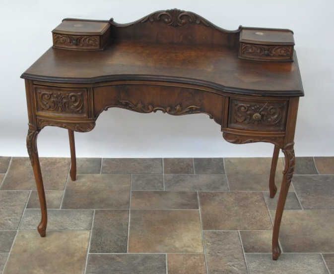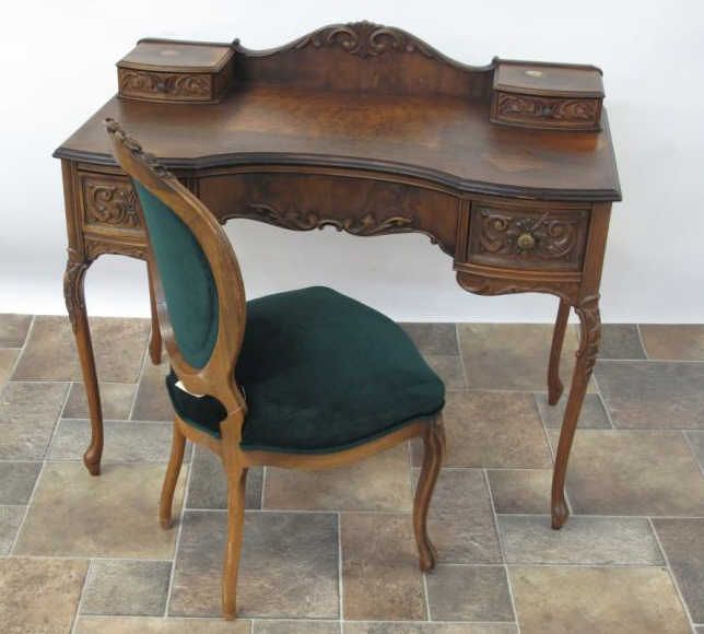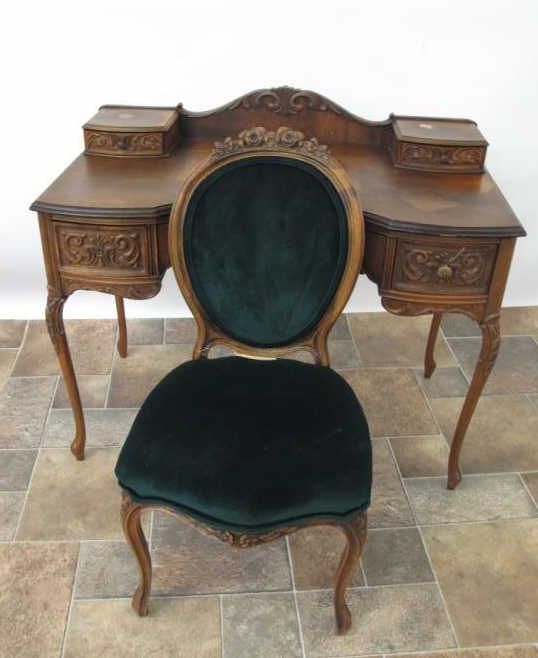 - with five drawers, on slender cabriolet legs. With hunter green upholstered chair.