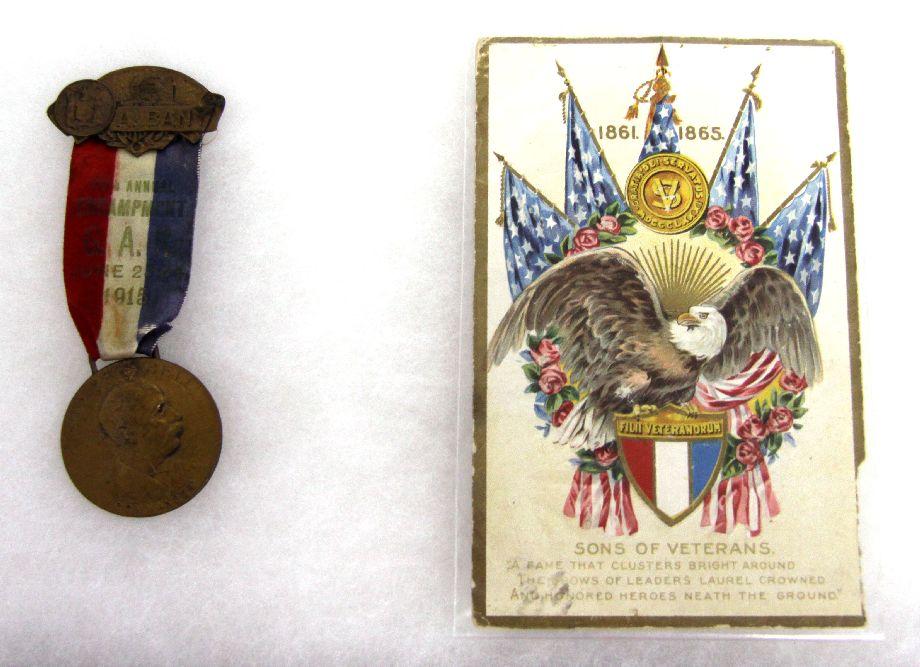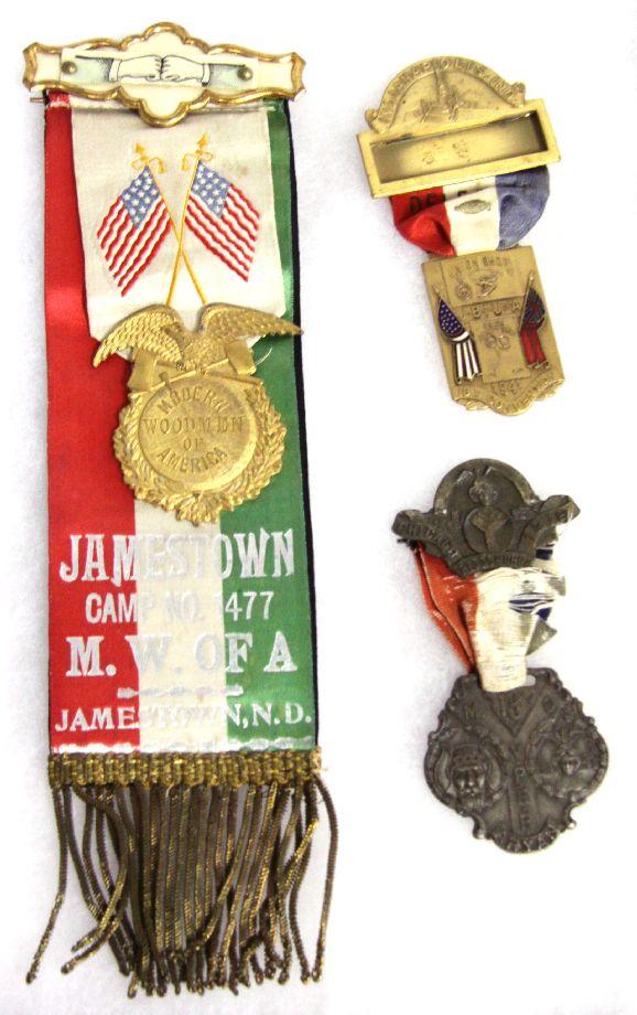 A grouping of various medals from early 20th Century organizations. A 1920's Modern Woodmen of America medal and ribbon "Jamestown Camp No. 1477 M.W. of A. / Jamestown N.D."; Journeymen Barbers' International Union of America convention medal from 1941; 1919 Aryan medal; 1915 GAR Civil War veteran, Albany NY "encampment medal", dated 1915, as well as a Grand Army of the Republic postcard.