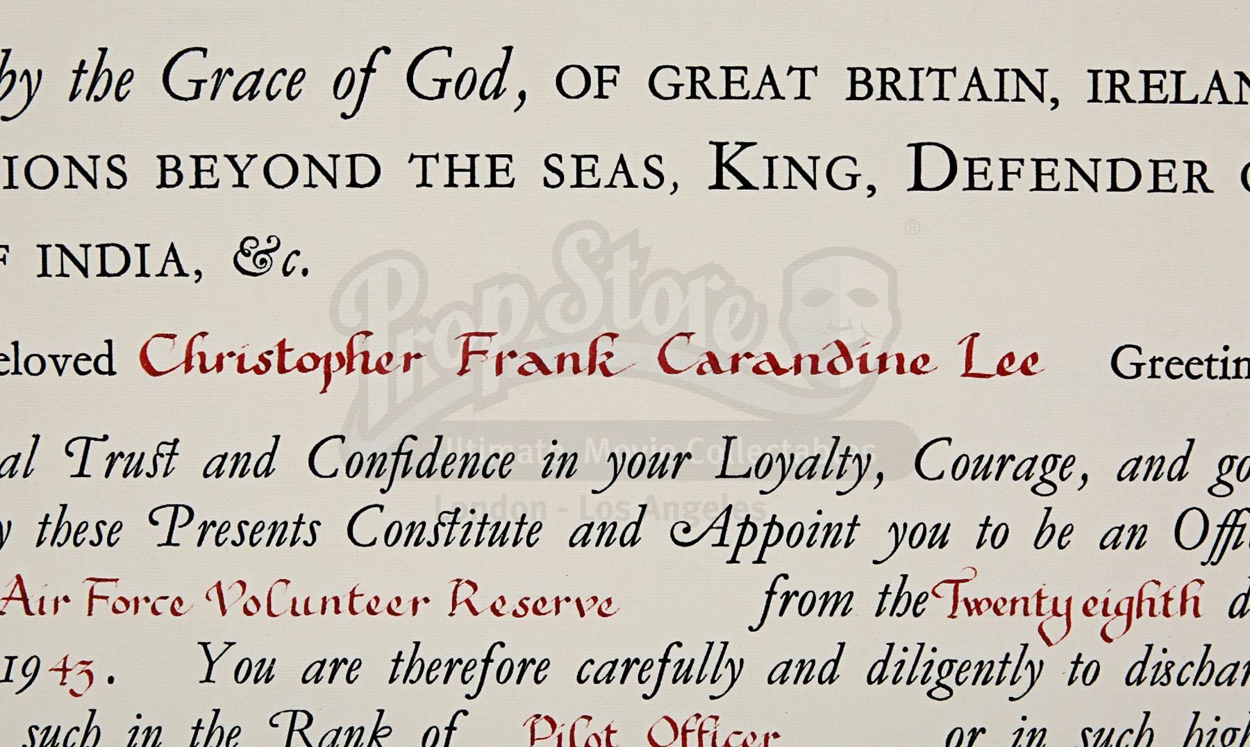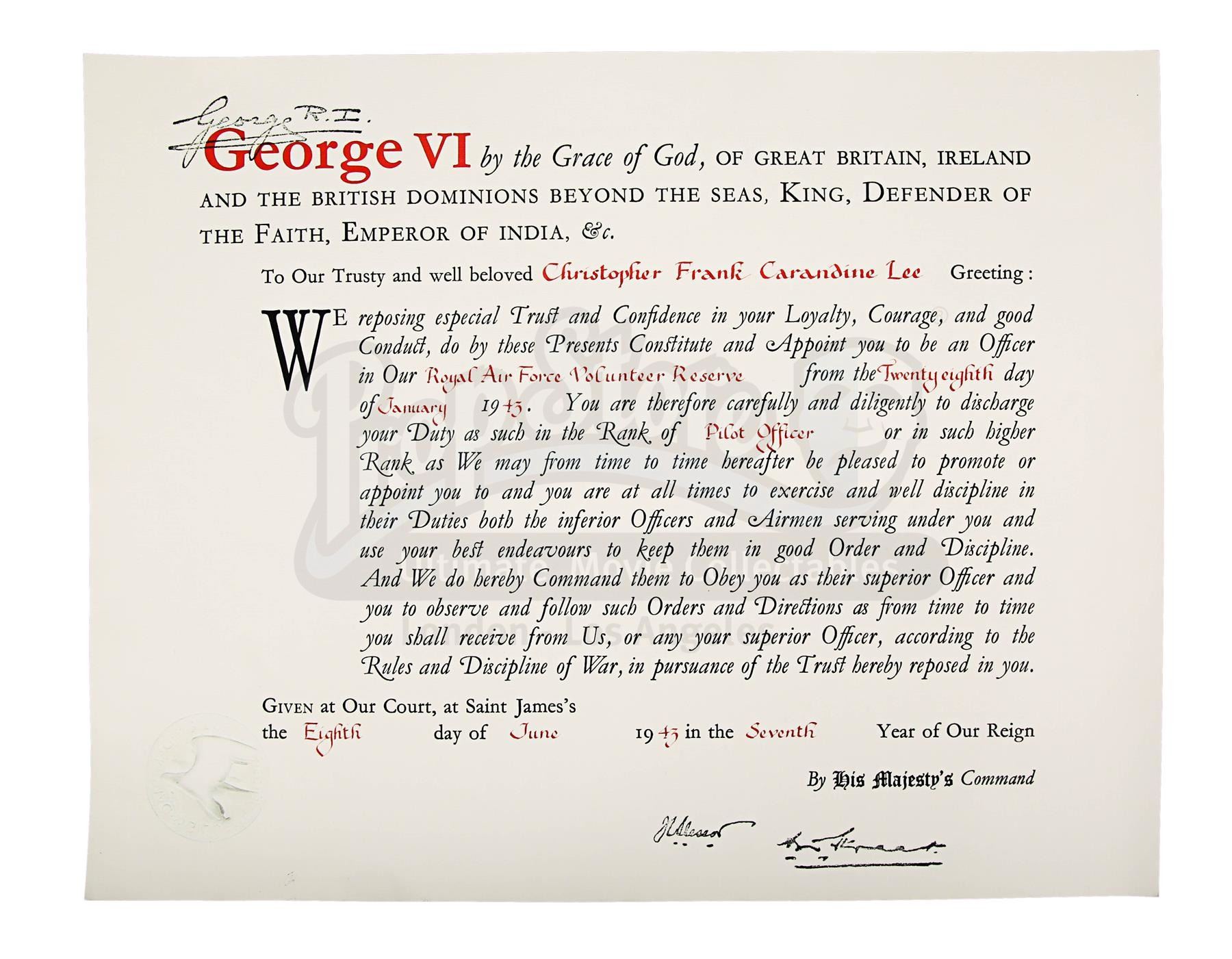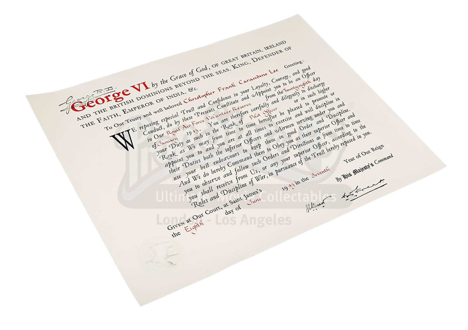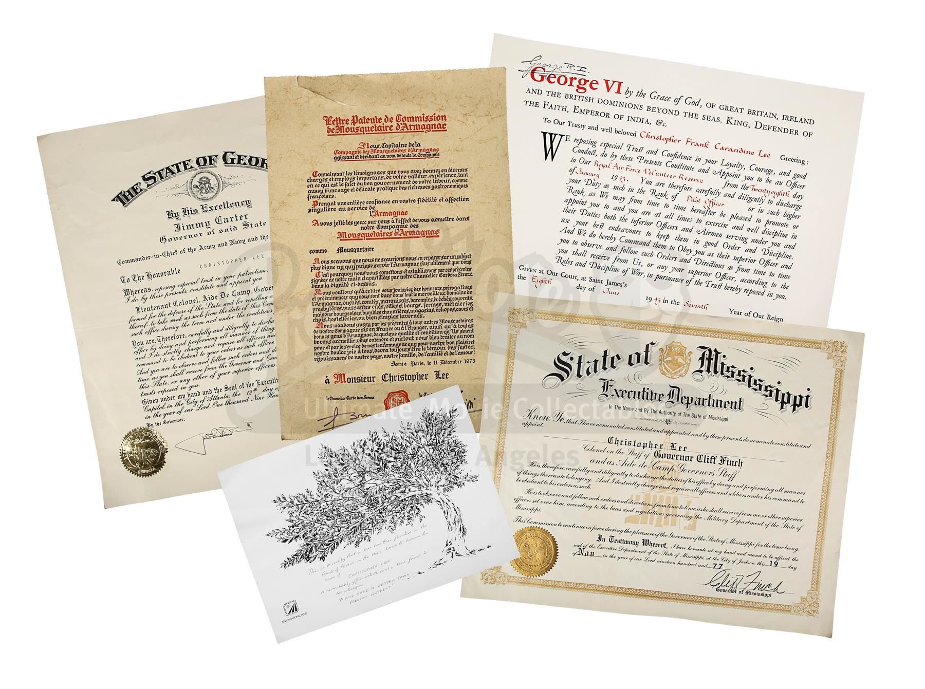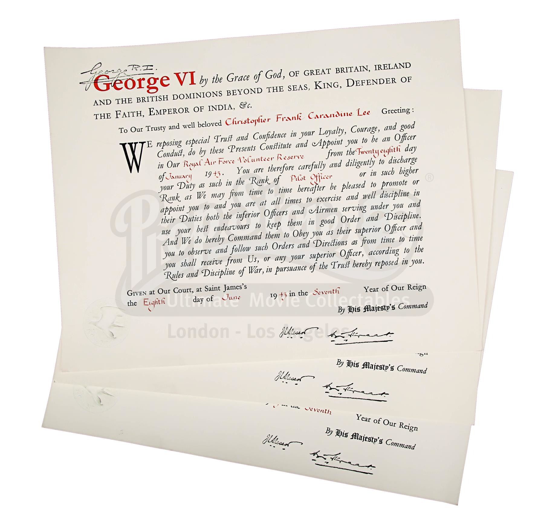 Seven certificates from Sir Christopher Lee's private collection, dated from 1943 to his death in 2015. These items come from the personal collection of legendary actor Sir Christopher Lee. The papers consist of: the registration of a tree planted in his memory by the Jewish National Fund; three appointments from King George VI (one as an RAF Officer, two as a Pilot Officer); his certificate of membership to the Company of Musketeers of Armagnac; and his nominations as Aide de Camp by Governor Cliff Hinch of Mississippi and Governor Jimmy Carter of Georgia.