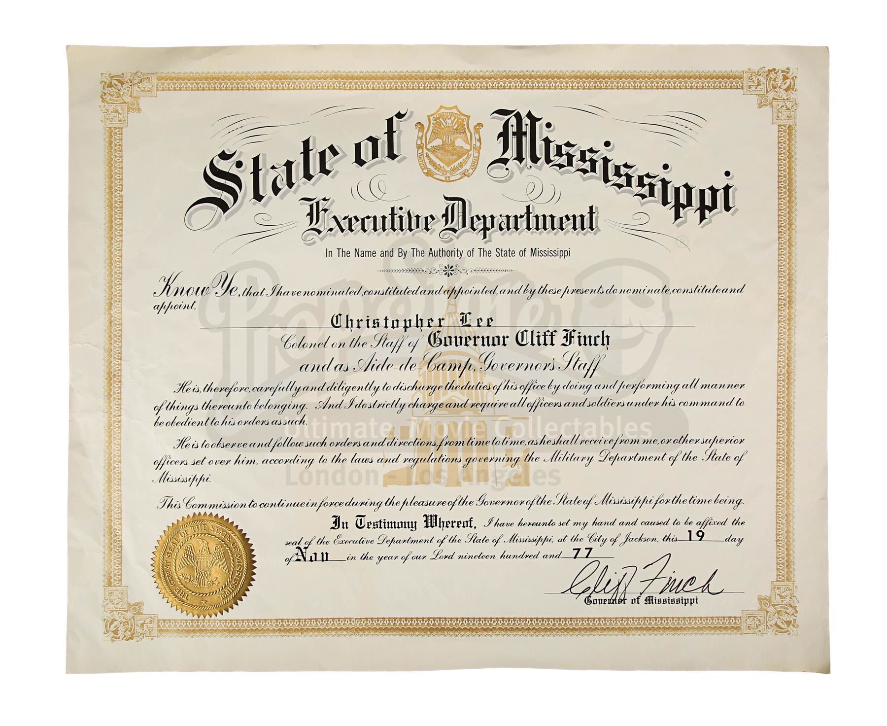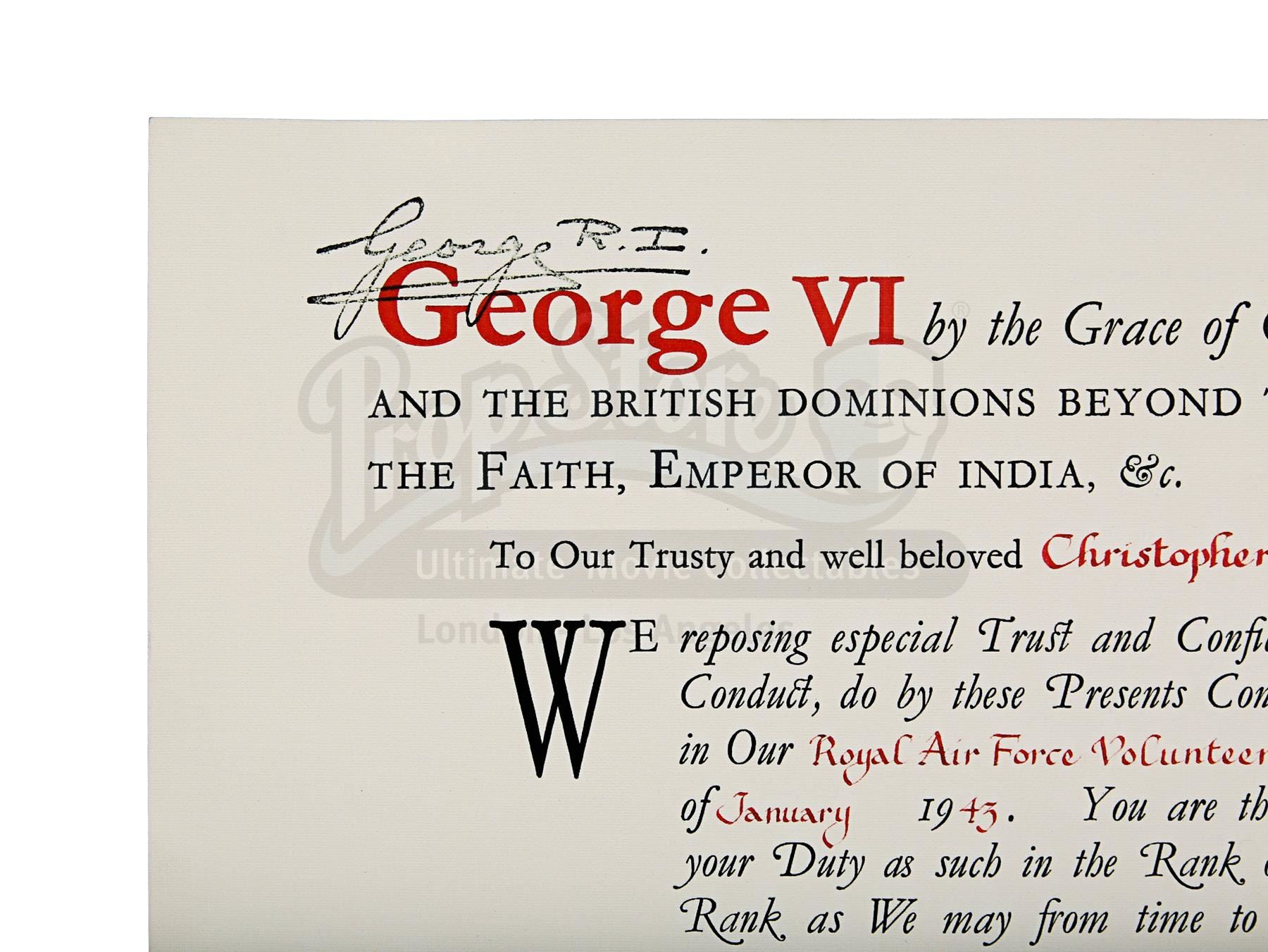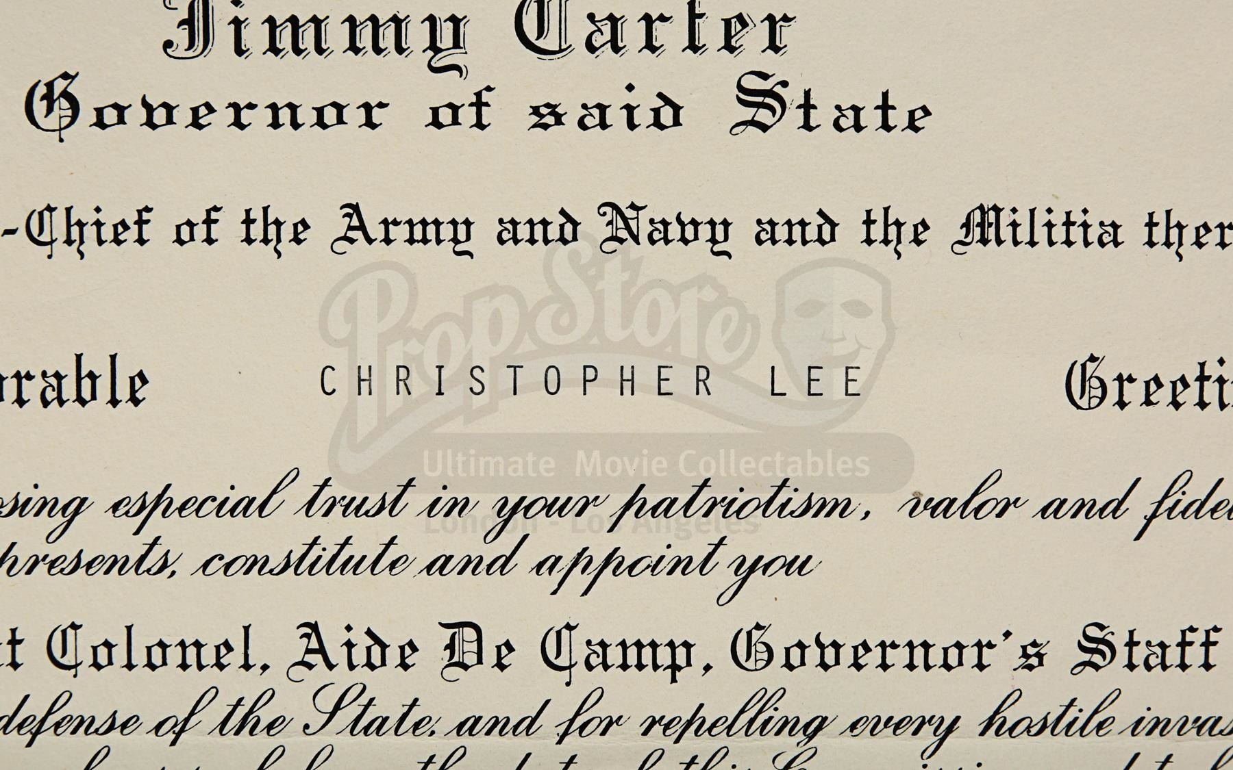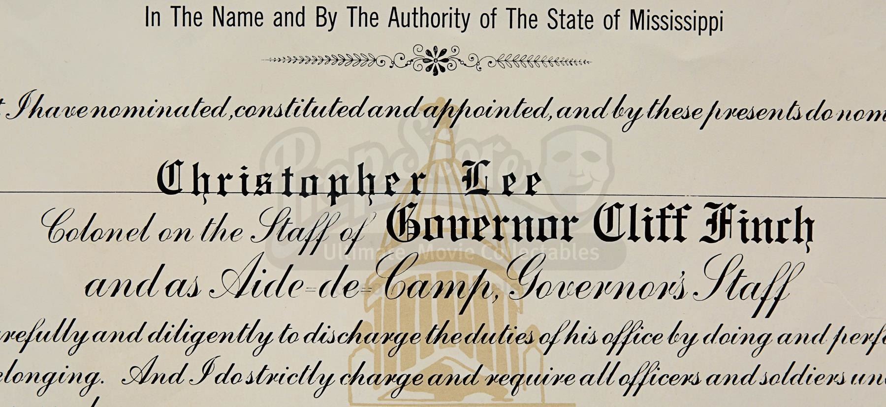 Seven certificates from Sir Christopher Lee's private collection, dated from 1943 to his death in 2015. These items come from the personal collection of legendary actor Sir Christopher Lee. The papers consist of: the registration of a tree planted in his memory by the Jewish National Fund; three appointments from King George VI (one as an RAF Officer, two as a Pilot Officer); his certificate of membership to the Company of Musketeers of Armagnac; and his nominations as Aide de Camp by Governor Cliff Hinch of Mississippi and Governor Jimmy Carter of Georgia.