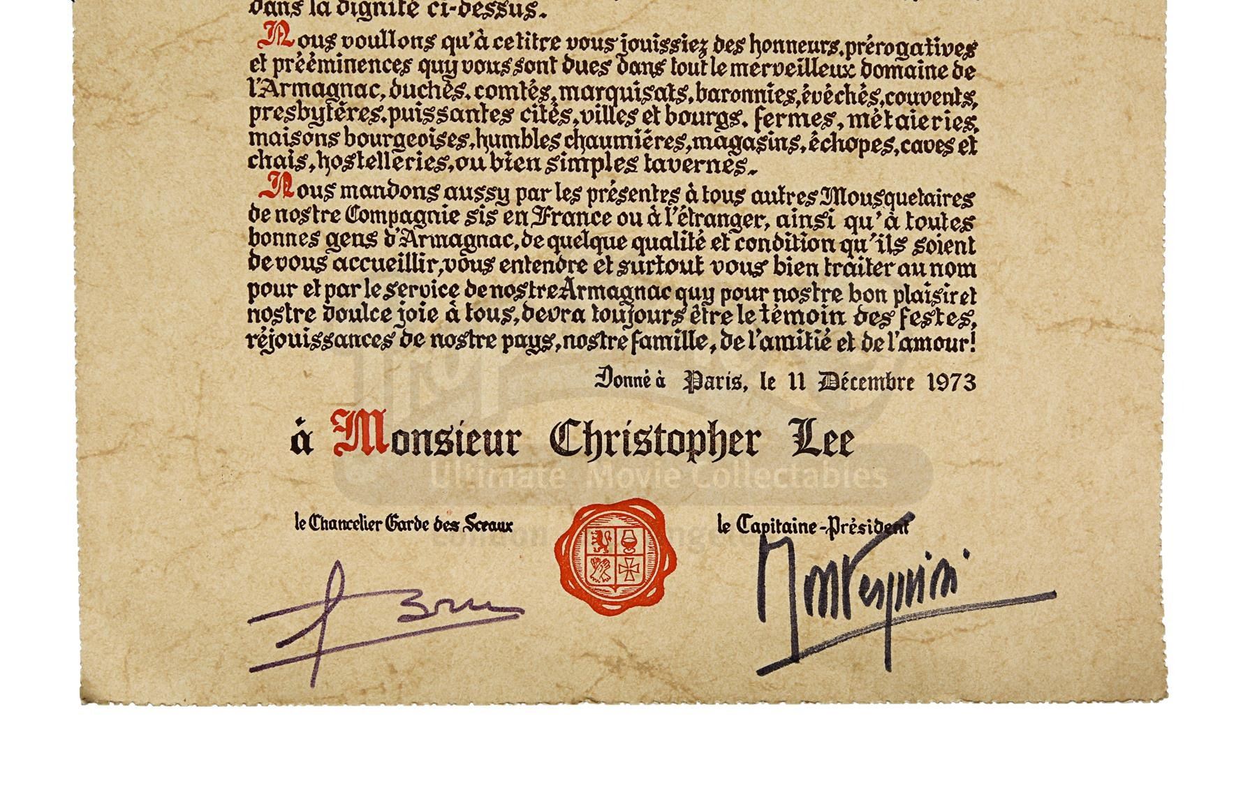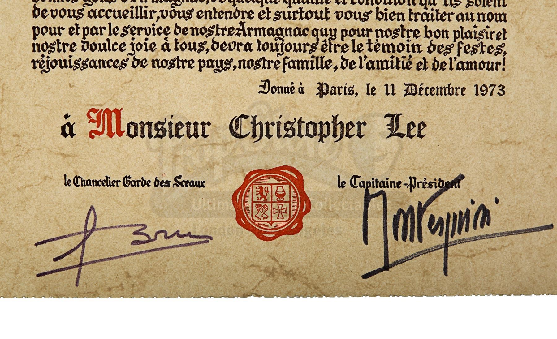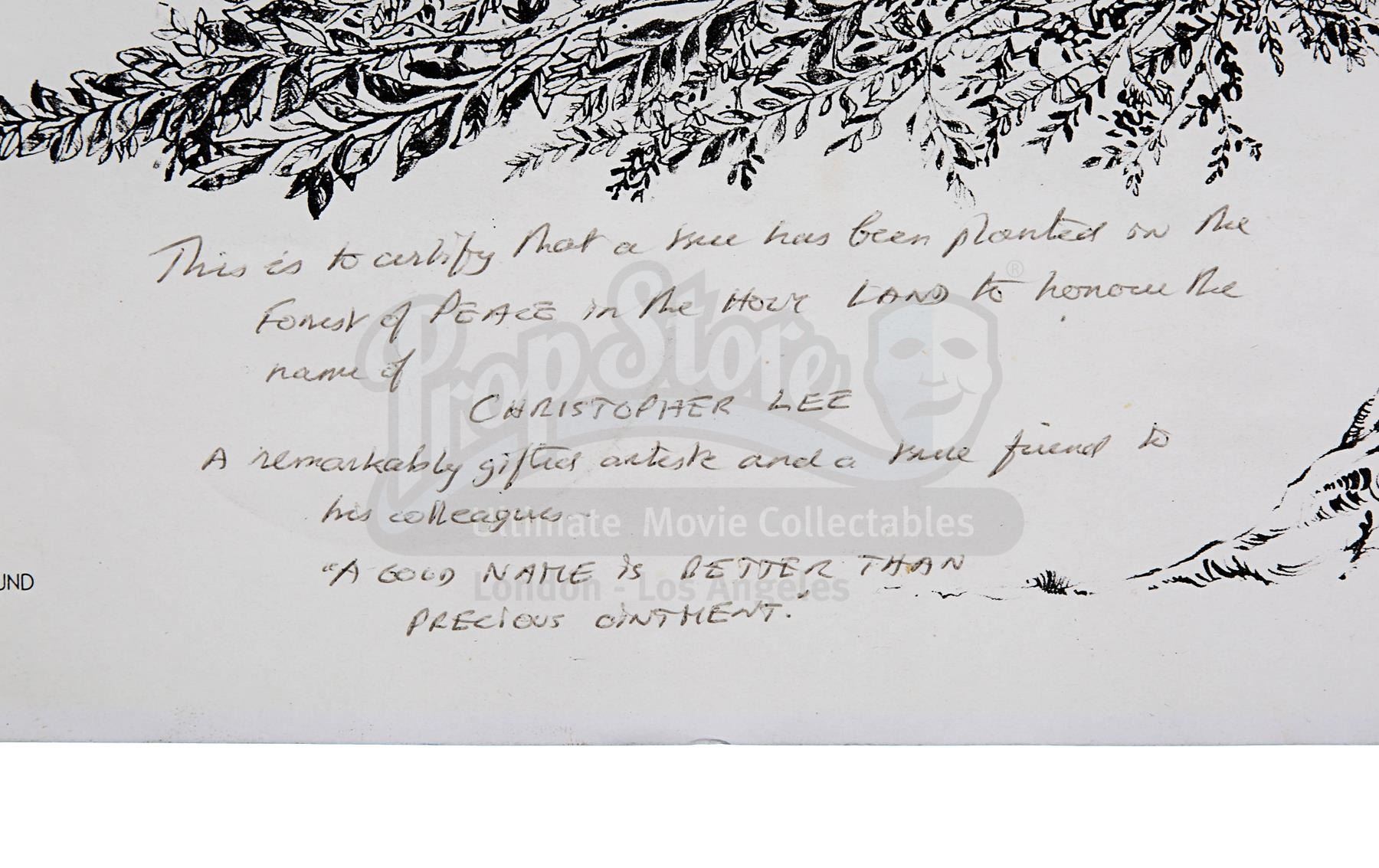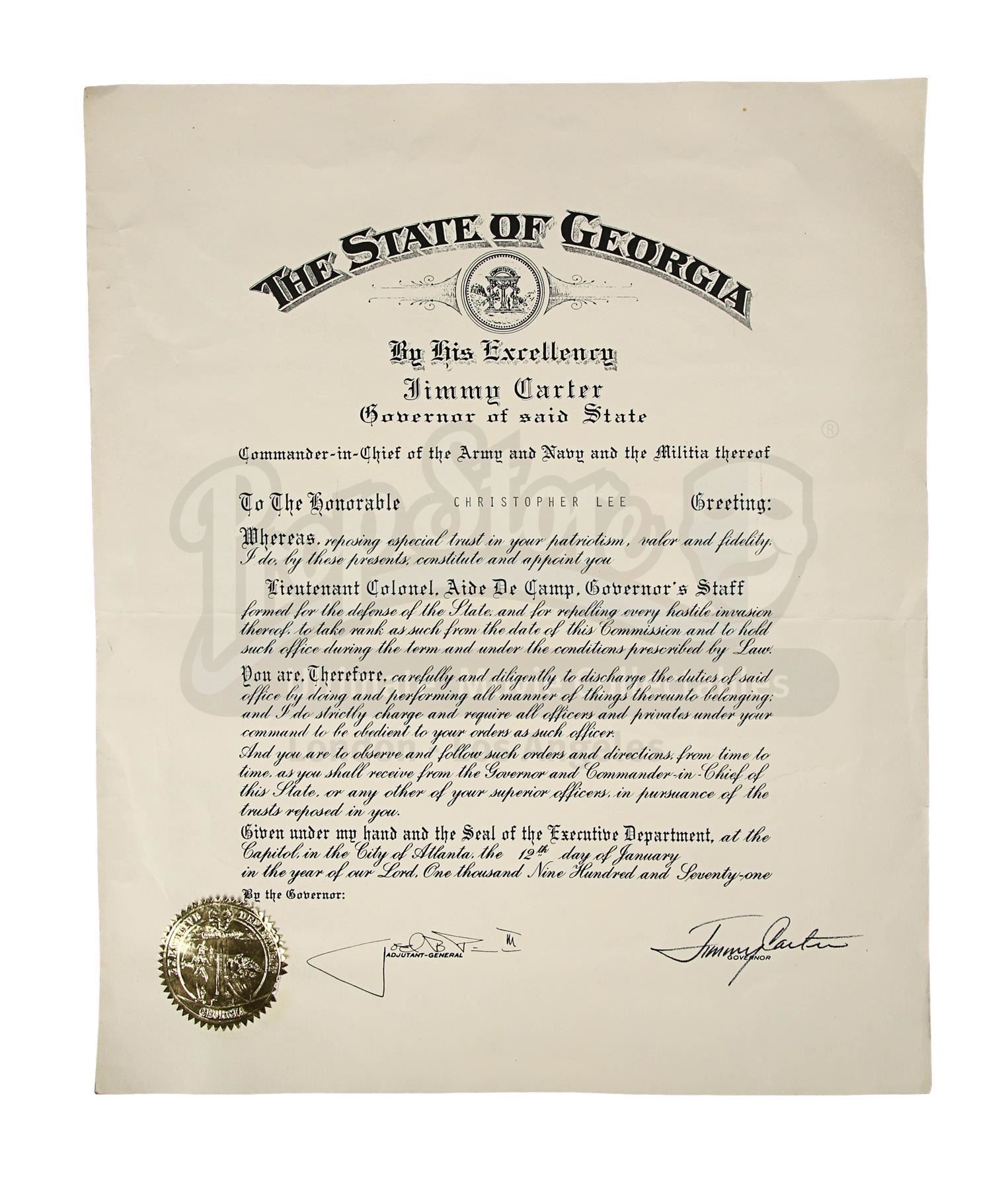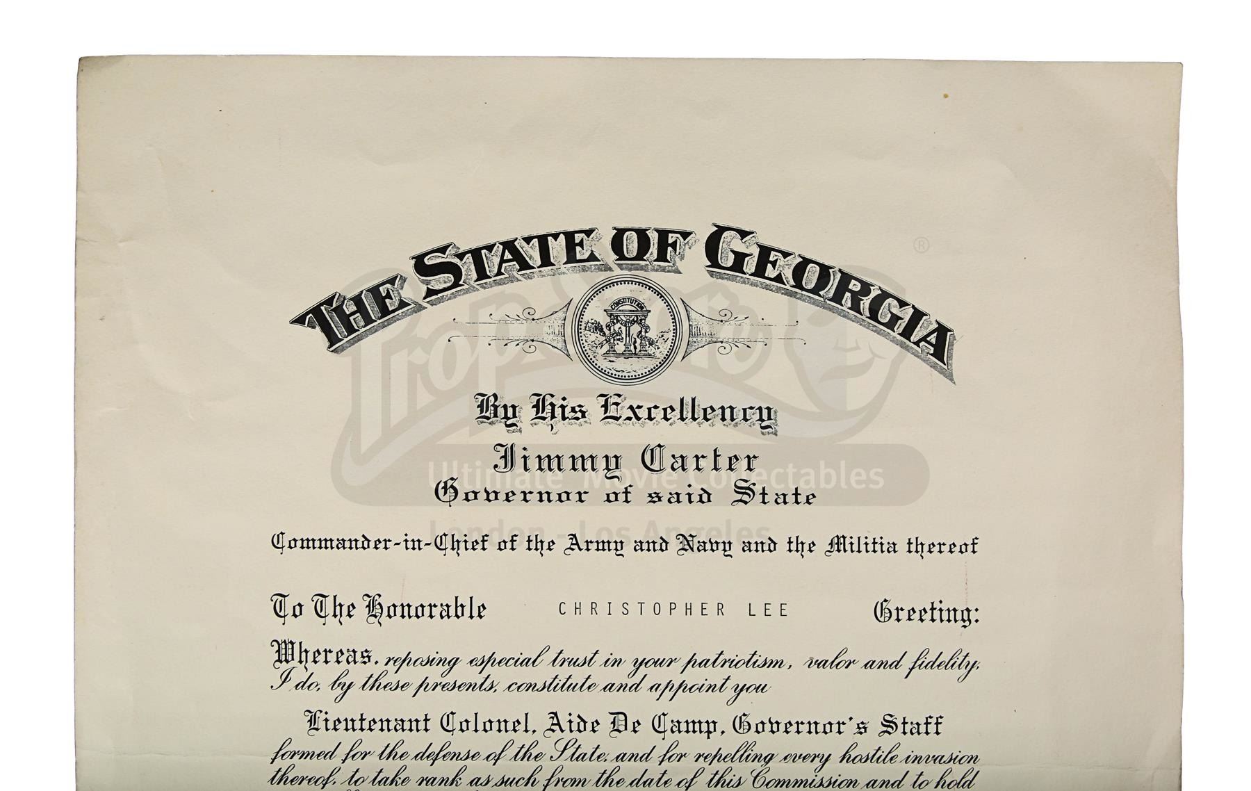Seven certificates from Sir Christopher Lee's private collection, dated from 1943 to his death in 2015. These items come from the personal collection of legendary actor Sir Christopher Lee. The papers consist of: the registration of a tree planted in his memory by the Jewish National Fund; three appointments from King George VI (one as an RAF Officer, two as a Pilot Officer); his certificate of membership to the Company of Musketeers of Armagnac; and his nominations as Aide de Camp by Governor Cliff Hinch of Mississippi and Governor Jimmy Carter of Georgia.