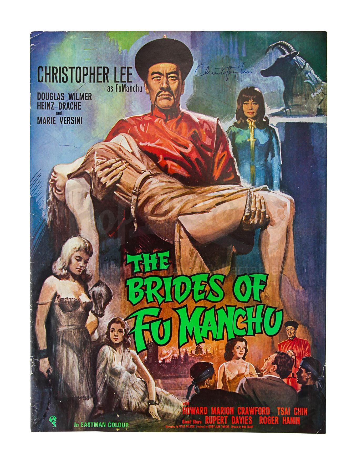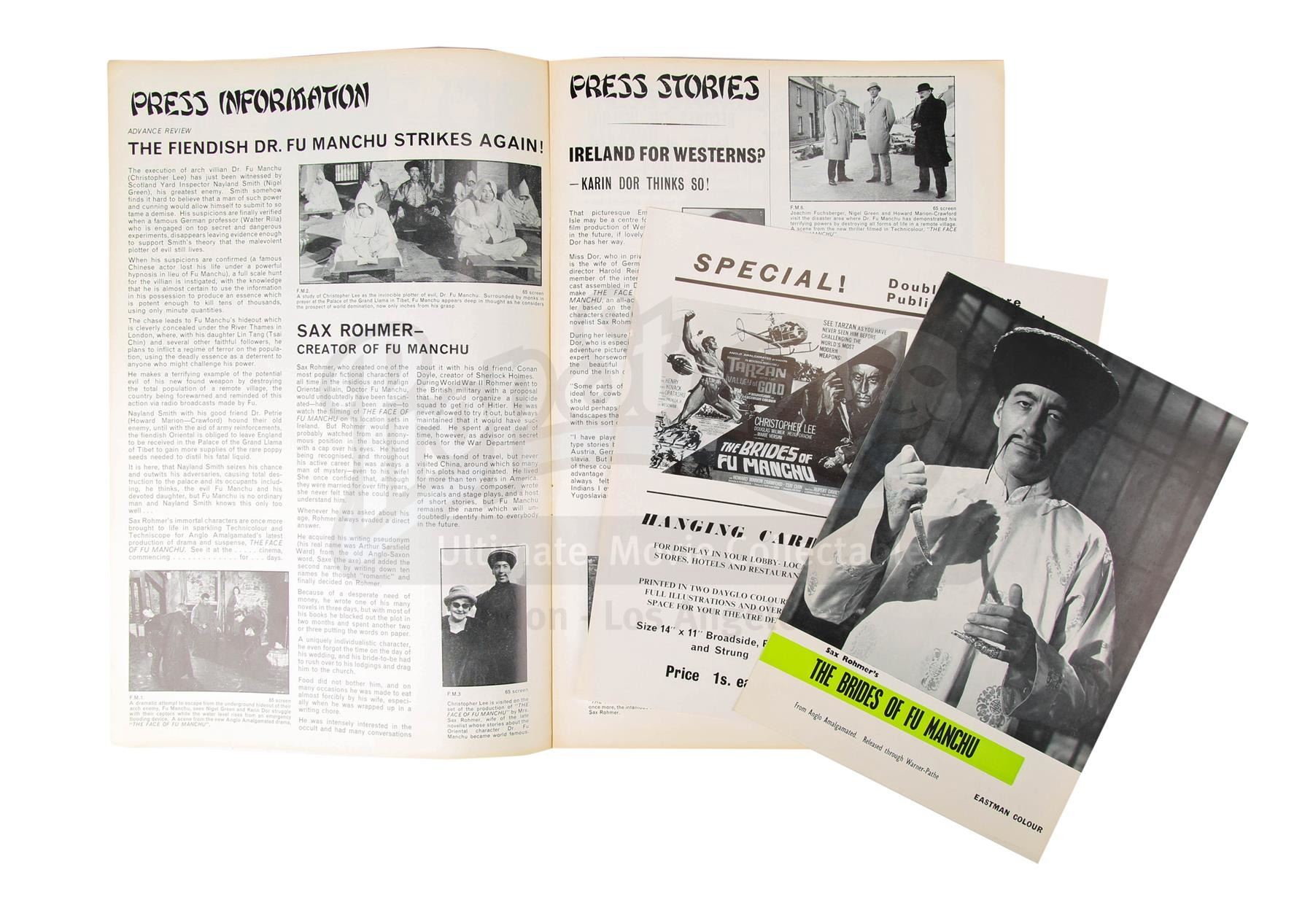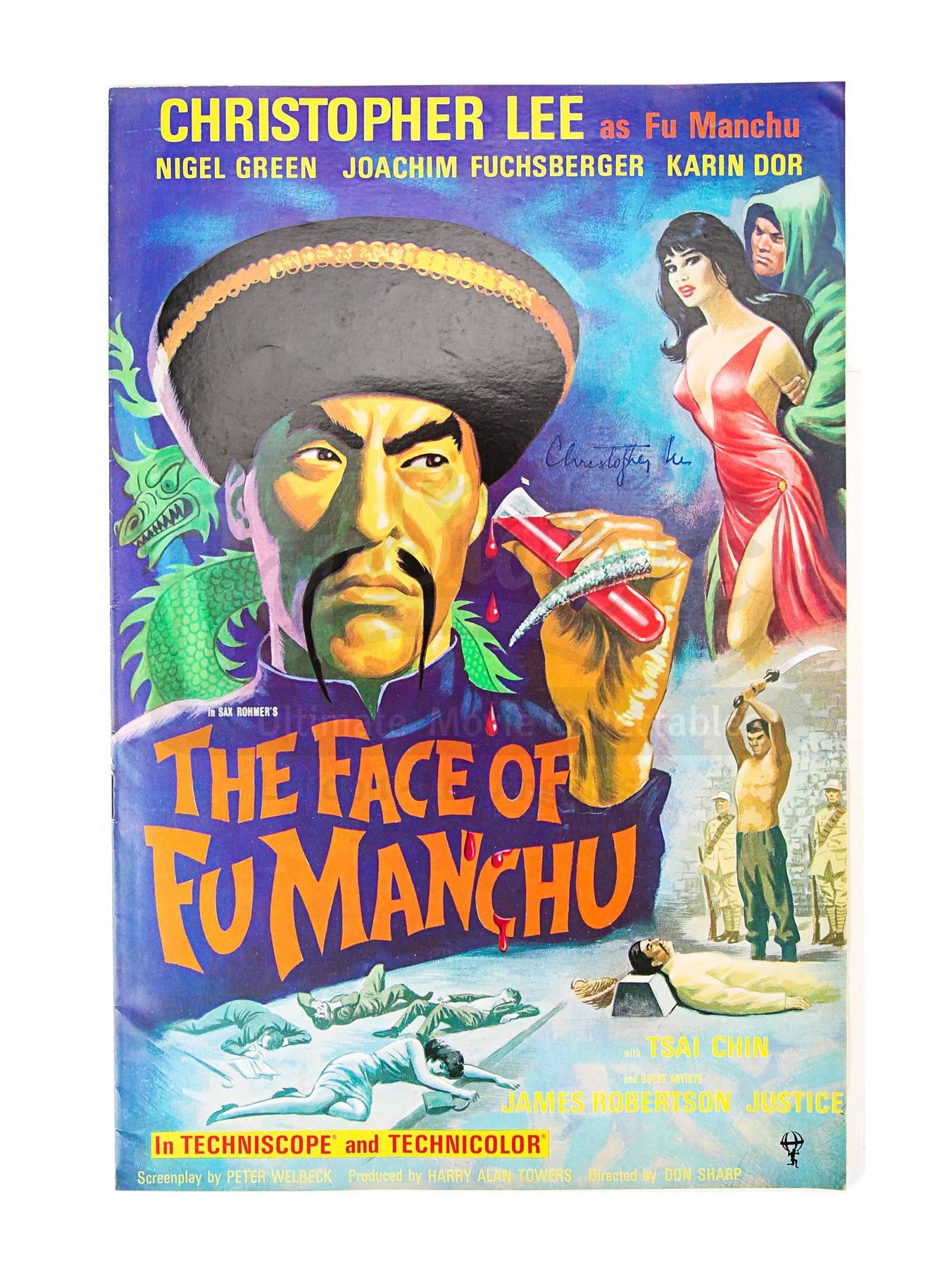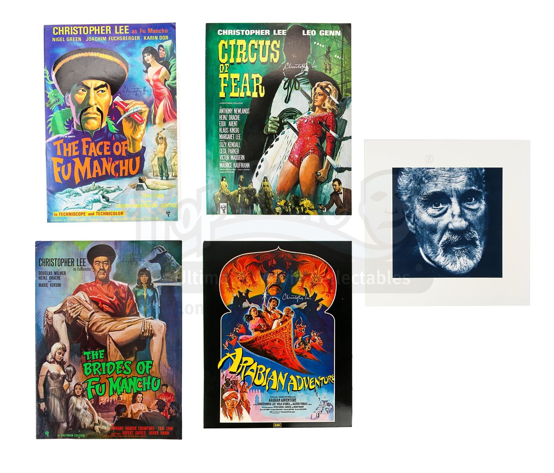 Four Christopher Lee-autographed press books and a photograph, from the promotion of his various productions. These items come from the personal collection of legendary actor Sir Christopher Lee.The lot consists of four autographed press kits, from The Face of Fu Manchu (1965), The Brides of Fu Manchu (1966), Circus of Fear (1966) and Arabian Adventure (1979), and a unique photograph taken of Lee at a book signing in Nottingham that was gifted to him by the photographer stated in a handwritten note. The press books and photograph show minor wear, edge wear and light creases. Dimensions (press kit): 38 cm x 28 cm x 1 cm (15" x 11" x 1/4"); (photo): 31 cm x 31 cm (12 1/4" x 12 1/4")