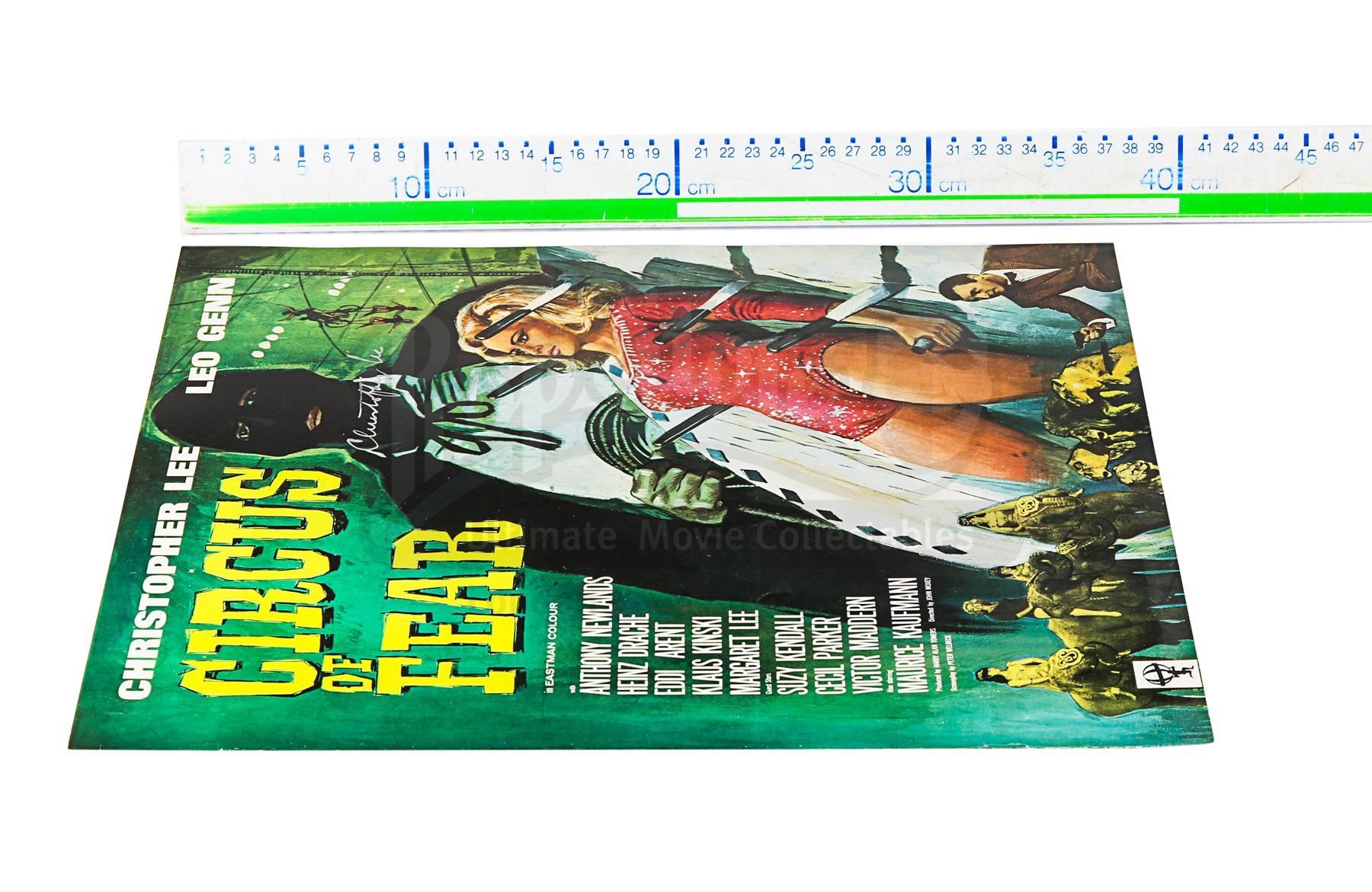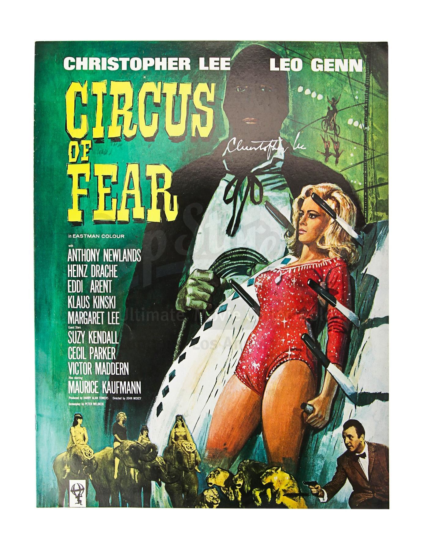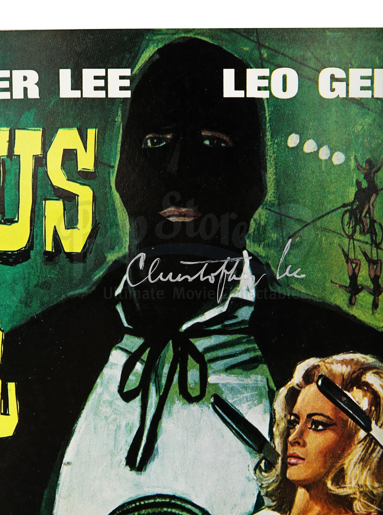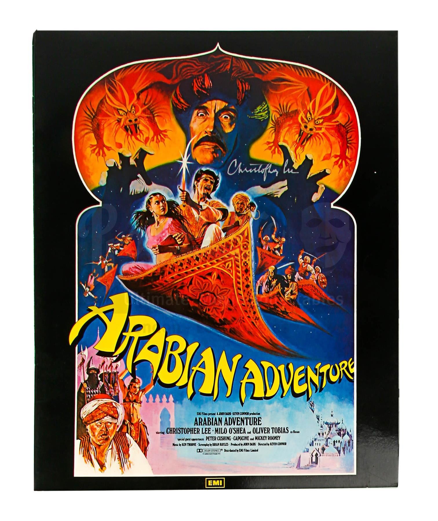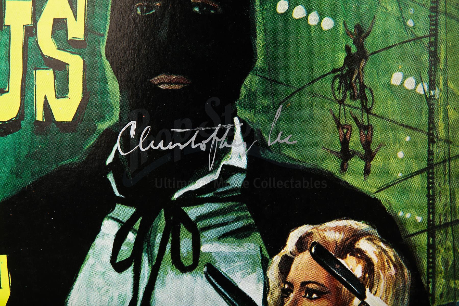 Four Christopher Lee-autographed press books and a photograph, from the promotion of his various productions. These items come from the personal collection of legendary actor Sir Christopher Lee.The lot consists of four autographed press kits, from The Face of Fu Manchu (1965), The Brides of Fu Manchu (1966), Circus of Fear (1966) and Arabian Adventure (1979), and a unique photograph taken of Lee at a book signing in Nottingham that was gifted to him by the photographer stated in a handwritten note. The press books and photograph show minor wear, edge wear and light creases. Dimensions (press kit): 38 cm x 28 cm x 1 cm (15" x 11" x 1/4"); (photo): 31 cm x 31 cm (12 1/4" x 12 1/4")