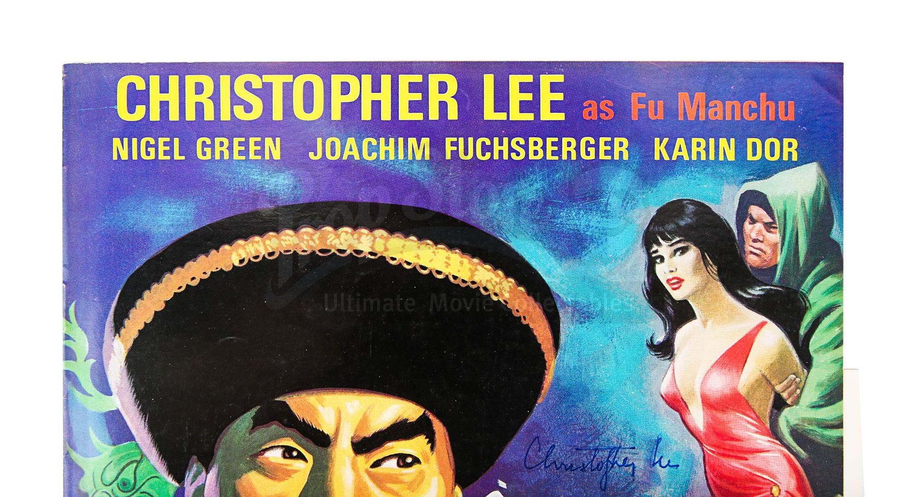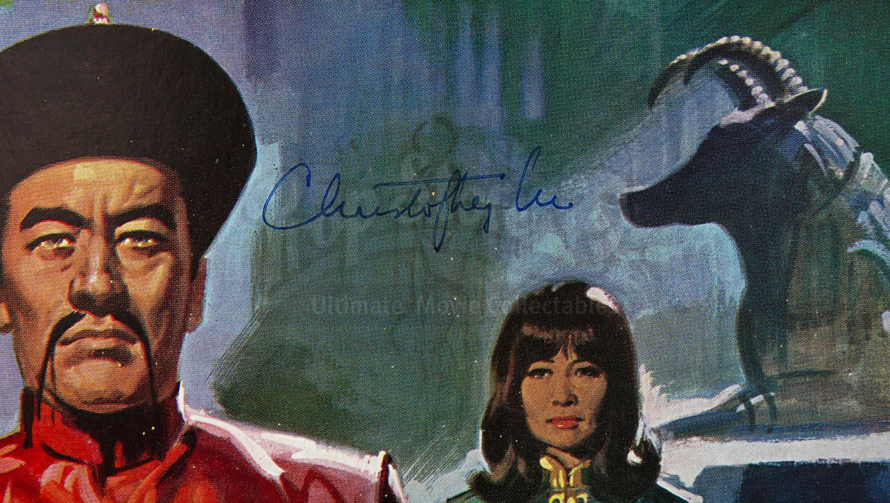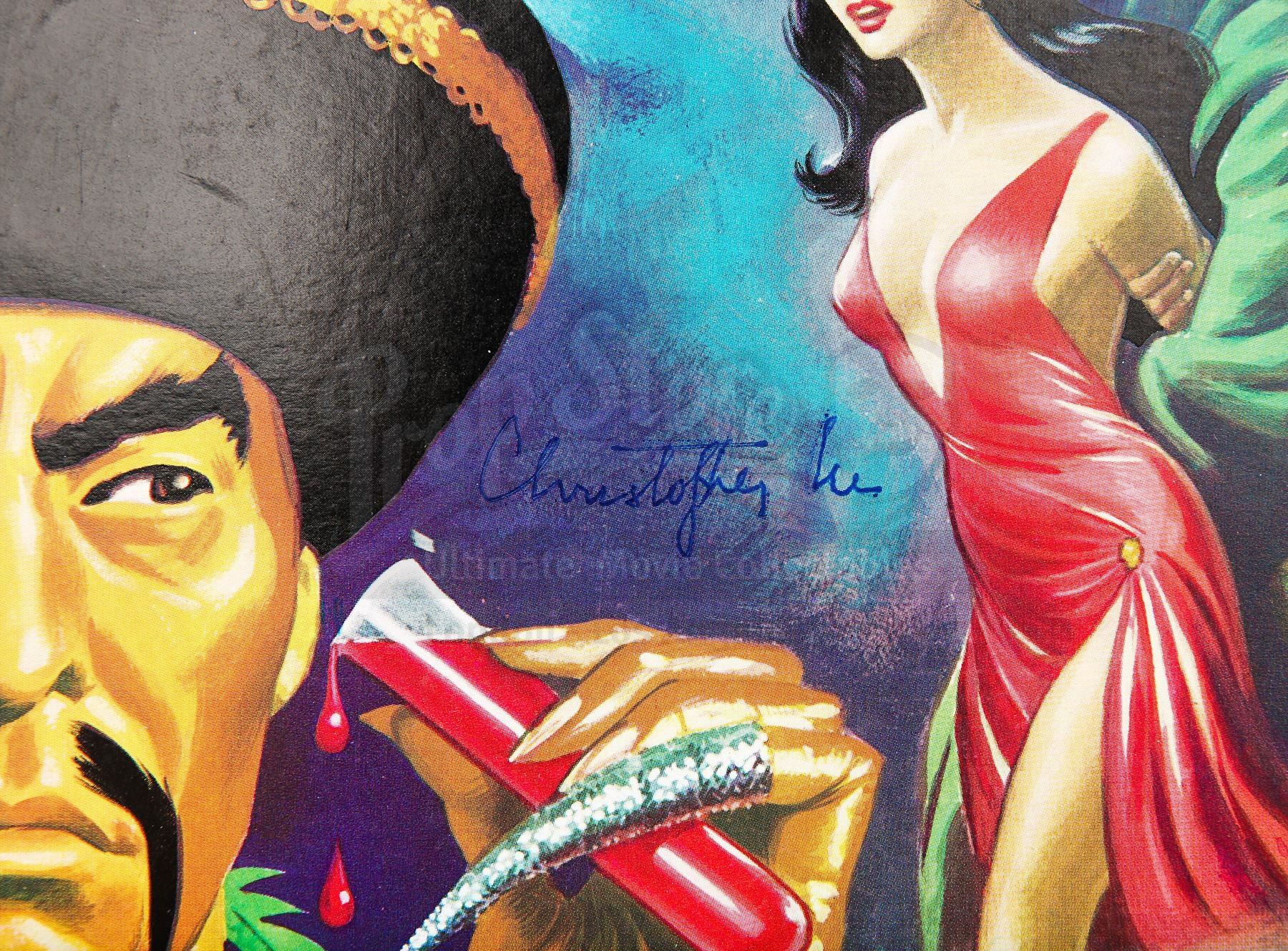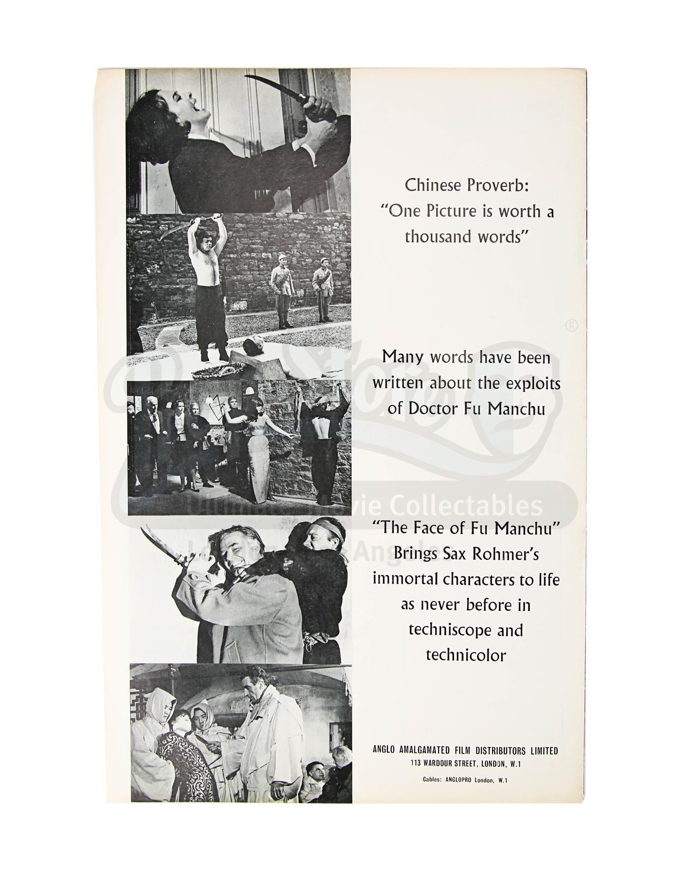 Four Christopher Lee-autographed press books and a photograph, from the promotion of his various productions. These items come from the personal collection of legendary actor Sir Christopher Lee.The lot consists of four autographed press kits, from The Face of Fu Manchu (1965), The Brides of Fu Manchu (1966), Circus of Fear (1966) and Arabian Adventure (1979), and a unique photograph taken of Lee at a book signing in Nottingham that was gifted to him by the photographer stated in a handwritten note. The press books and photograph show minor wear, edge wear and light creases. Dimensions (press kit): 38 cm x 28 cm x 1 cm (15" x 11" x 1/4"); (photo): 31 cm x 31 cm (12 1/4" x 12 1/4")