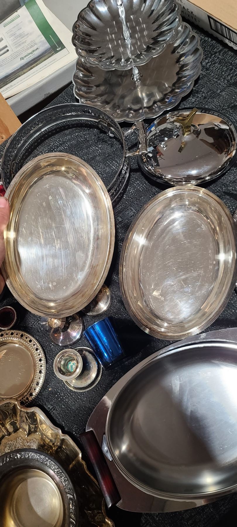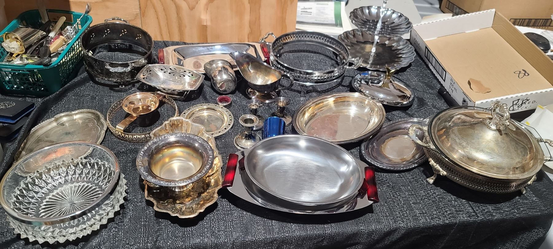 VARIOUS SILVER & SILVER PLATTED SILVERWARE: CANDLE HOLDERS, GRAVY BOAT, NAPKIN RINGS, GLASS INSERTS, PSI