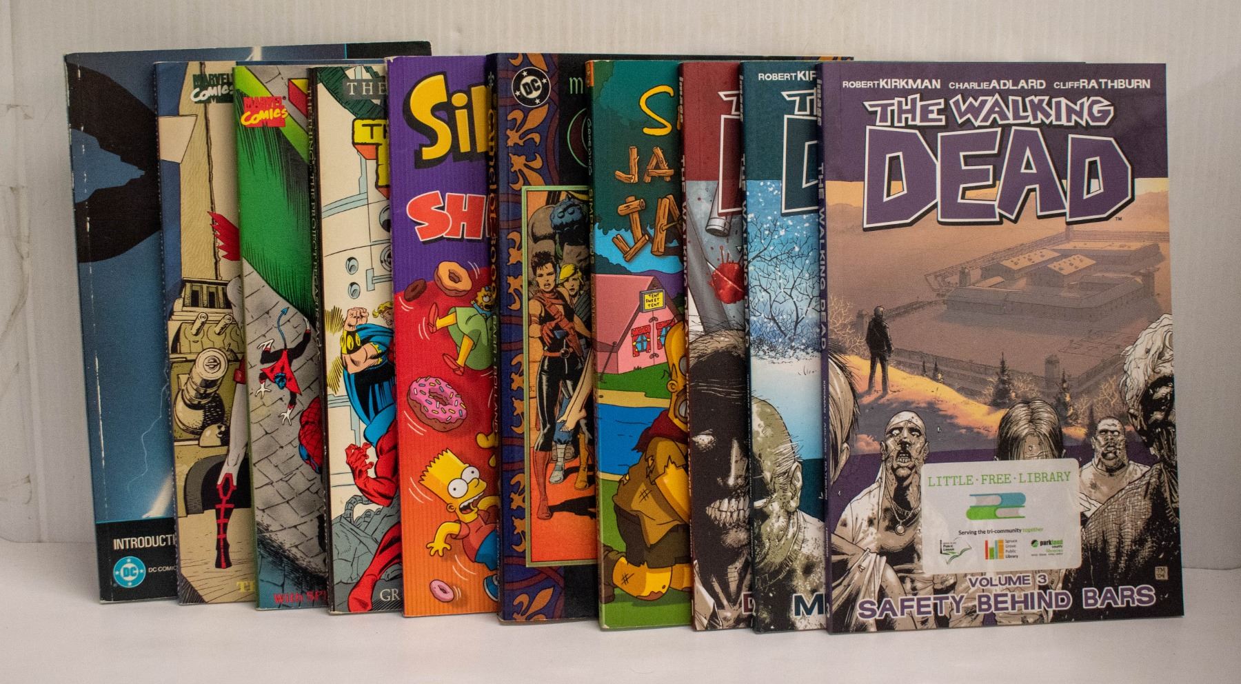 THE DARK KNIGHT RETURNS, THOR: BALLAD OF BETA RAY BILL, X-MEN: IN THE SAVAGE LAND, THING: PREOJECT PEGASUS SAGA, SIMPSONS: SHAKE-UP, CAMELOT 3000; SIMPSONS: JAM-PACKED JAMBOREE, WALKING DEAD - VOLUMES 1-3; TPB