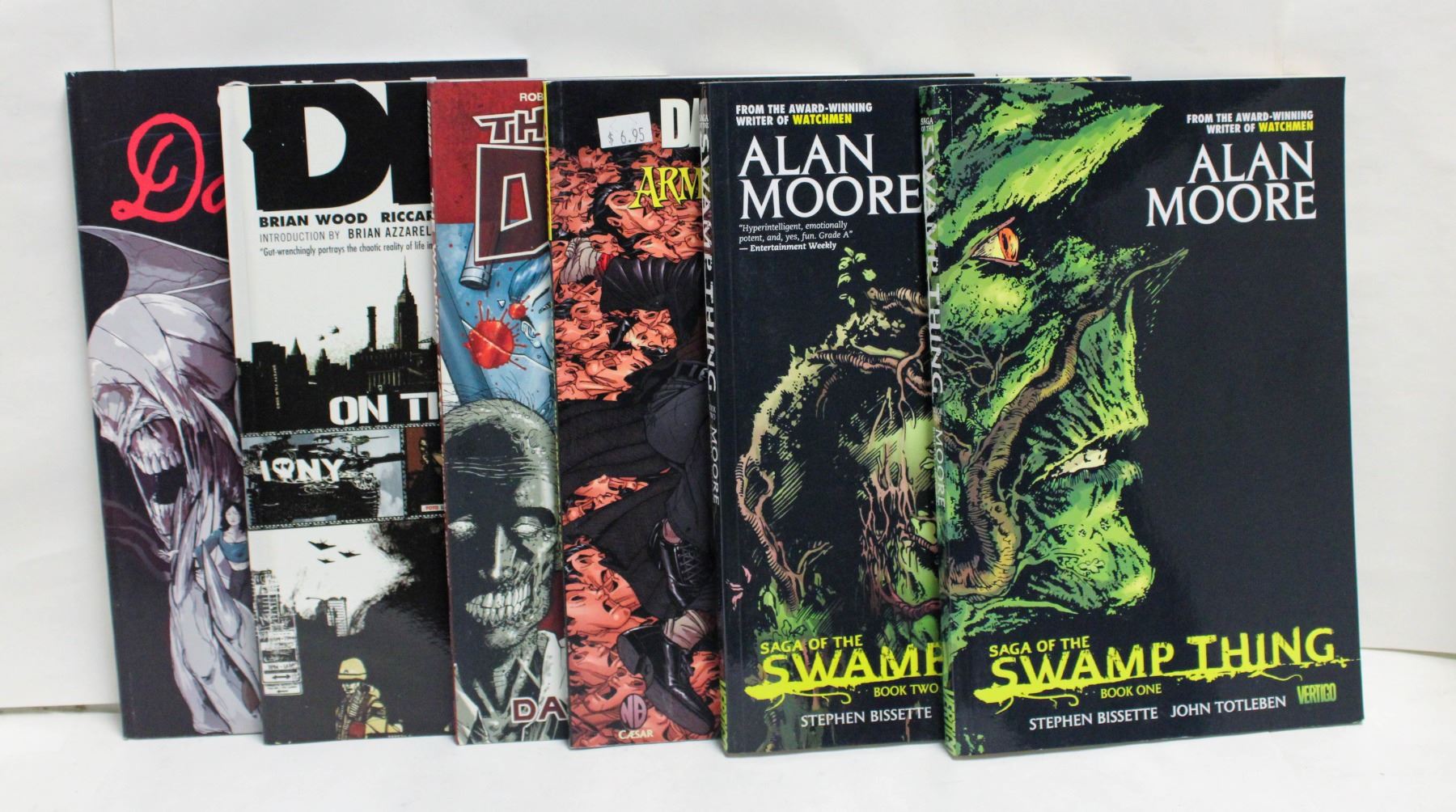 SAGA OF THE SWAMP THING VOL #1 AND #2 (ALAN MOORE); DARKMAN VS ARMY OF DARKNESS; WALKING DEAD; DMZ: ON THE GROUND; COVER OF DARKNESS