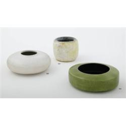 <b>Description: </b>green glazed ceramic, incised signature on the underside 3 1/2 in. (9 cm) high8 1/4 in. (21 cm) diameter