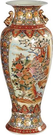 "VASE WITH PEACOCK" - NAMESAKE BEDAZZLING A SCRAMBLING PEAHEN AS HIS TAIL MAKES HER THINK A THOUSAND ADMIRING EYES ARE FOCUSED ON HER - TRADITIONAL - DIMENTIONS - 10DIAx 25H - WEIGHT -