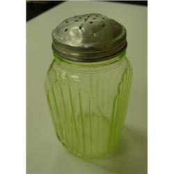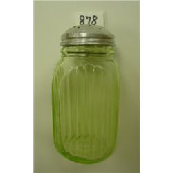 Vaseline depression glass shaker by Anchor Hocking. Ribbed with diagonal blank space for label. Original aluminum lid has dents and a tight 1/2" cut, but it is quite serviceable. 5.25" tall with lid. 2.5" wide. Condition: Glass is Very Good