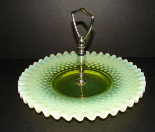 OPALESCENT VASELINE GLASS BON-BON SERVER. Hobnailed pattern. Ruffled edge. 8.25” Dia.