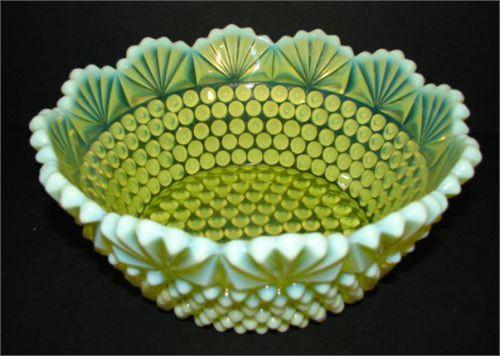 OPALESCENT VASELINE GLASS BOWL. Hobnailed pattern. No mark. 3.25” H, 7.75” Dia.