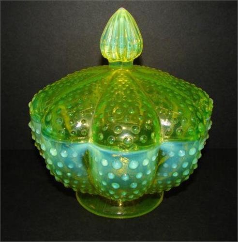 OPALESCENT VASELINE GLASS COVERED CANDY DISH. Puffy paneled form with hobnailed pattern. No mark. 7” H to top of finial.