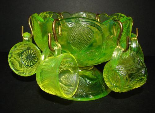 VASELINE GLASS CHILD’S PUNCH BOWL SET. Consists of miniature punch bowl and 6 miniature handled cups. All are decorated with incised strawberry pattern decoration. Punch bowl: 3.5” H, 4.5” Dia.
