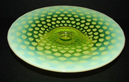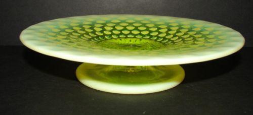 OPALESCENT VASELINE GLASS ELEVATED CIRCULAR SERVING PLATE. Hobnailed pattern. No mark. 1.75” H, 7.75” Dia.