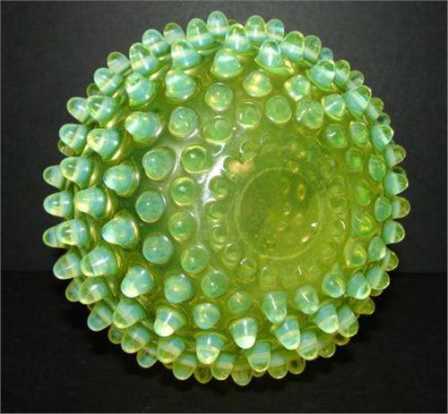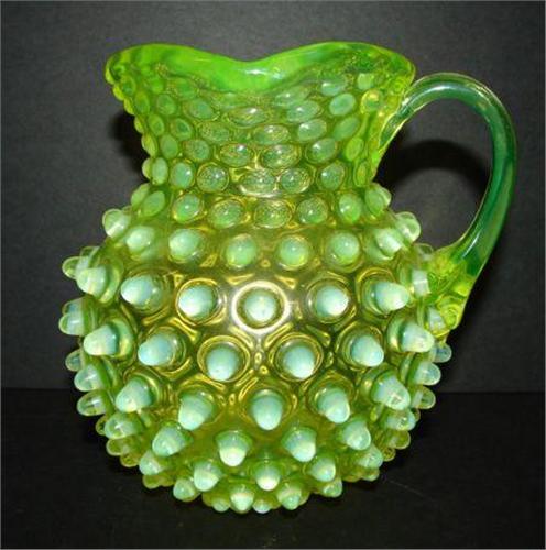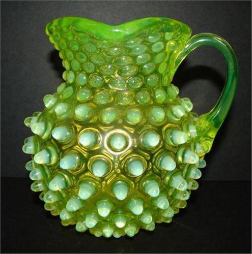 OPALESCENT VASELINE GLASS CREAMER. Hobnailed pattern. Applied glass handle. No mark. 5” H
