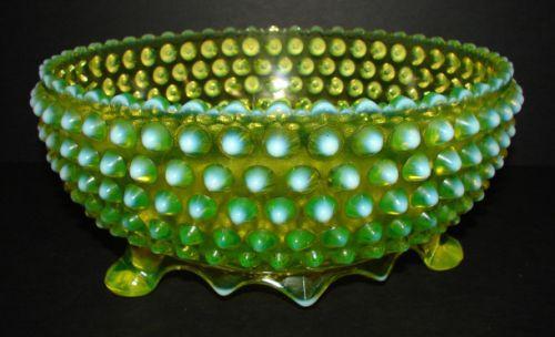 OPALESCENT VASELINE GLASS FOOTED BOWL. Hobnailed pattern. No mark. 3.75” H, 8.5” Dia.