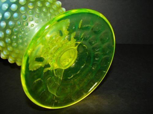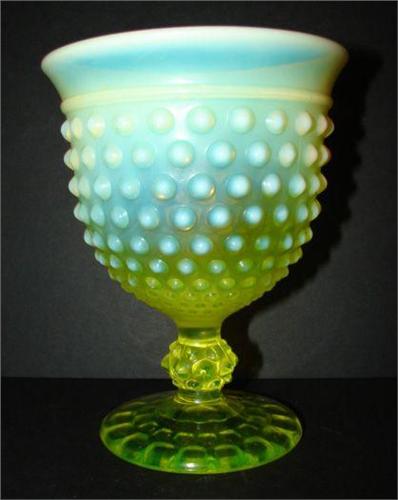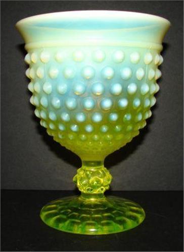 OPALESCENT VASELINE GLASS GOBLET. Hobnailed pattern. No mark. 6” H