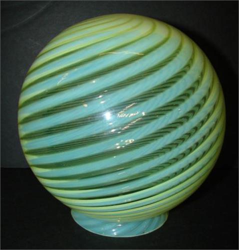 VASELINE OPALESCENT GLASS LAMP SHADE. Dome form with swirl pattern. Shows some roughness along bottom edge. 6” H, 3.125” Dia. (at bottom).