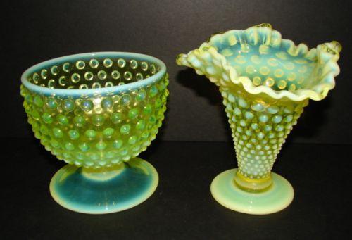 OPALESCENT VASELINE GLASS OPEN CANDY DISH AND VASE WITH FLUTED TOP. Hobnailed pattern. Candy dish: 4.25” H. Vase: 5.5” H