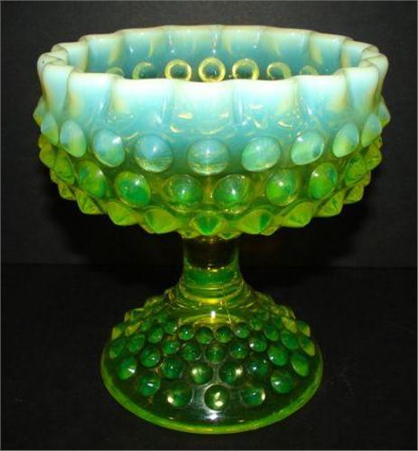 OPALESCENT VASELINE GLASS OPEN COMPOTE. Hobnailed pattern. No mark. 5.75” H