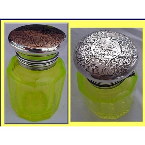 Victorian cut green vaseline glass perfume / scent bottle with chased and engraved silver lid.