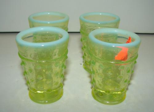 SET OF 4 SMALL VASELINE OPALESCENT GLASS SHOT GLASSES. Hobnailed pattern. No mark. 2” H