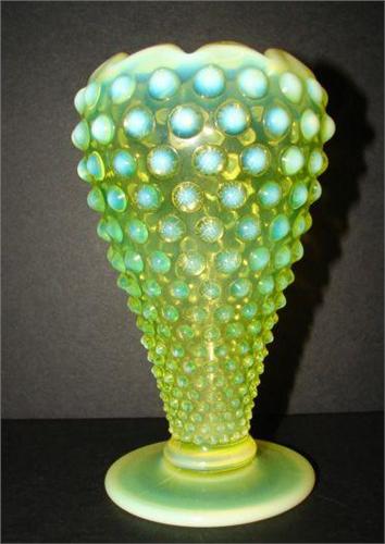 OPALESCENT VASELINE GLASS VASE. Hobnailed pattern. No mark. 5.5” H