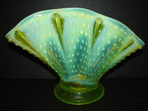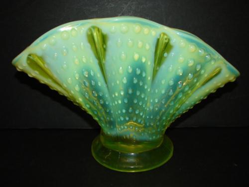 VASELINE OPALESCENT GLASS FAN VASE. Hobnailed pattern with puffy panels. 5.5” H