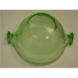 Vaseline "Slick Handle" green depression glass bowl by U.S. Glass. Rings around bottom and base. 9" wide, 4.5" tall. Condition: Flake at base & inside rim; roughness inside handles; otherwise good.