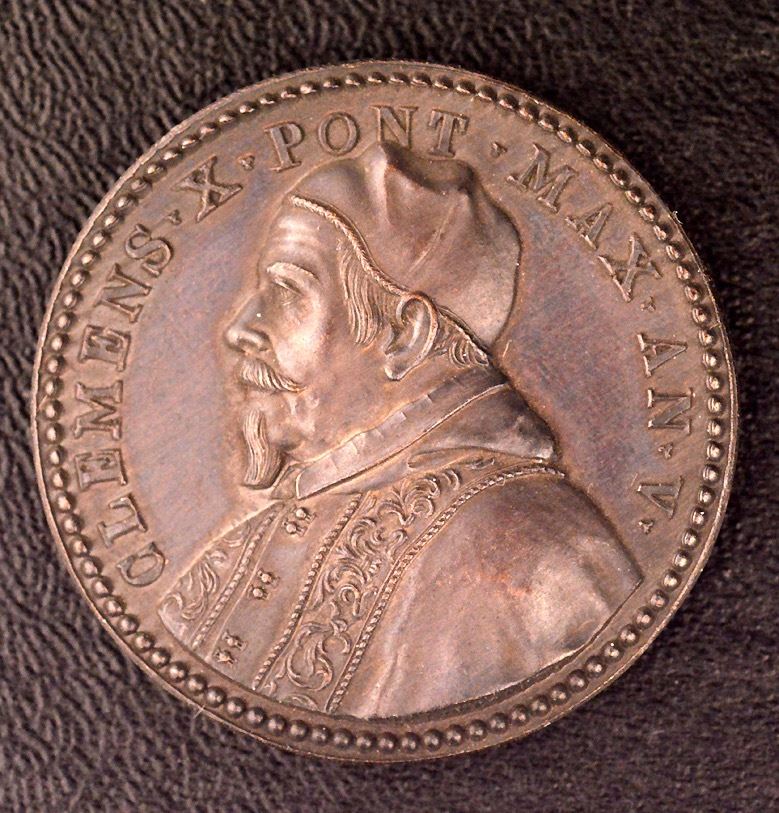 Clement X, Vctory of Johann Sobieski at Chocim medal, Obv: profile bust of pope, "CLEMENS X PONT MAX AN V"; Rev: Polish officer presents Turkish banner to the pope, "TVRGAR A POLONIS RELATA", "MDCLXXIV" in exergue. Ae, 39 mm, by Girolamo Lucenti. Nearly FDC. Scarce.