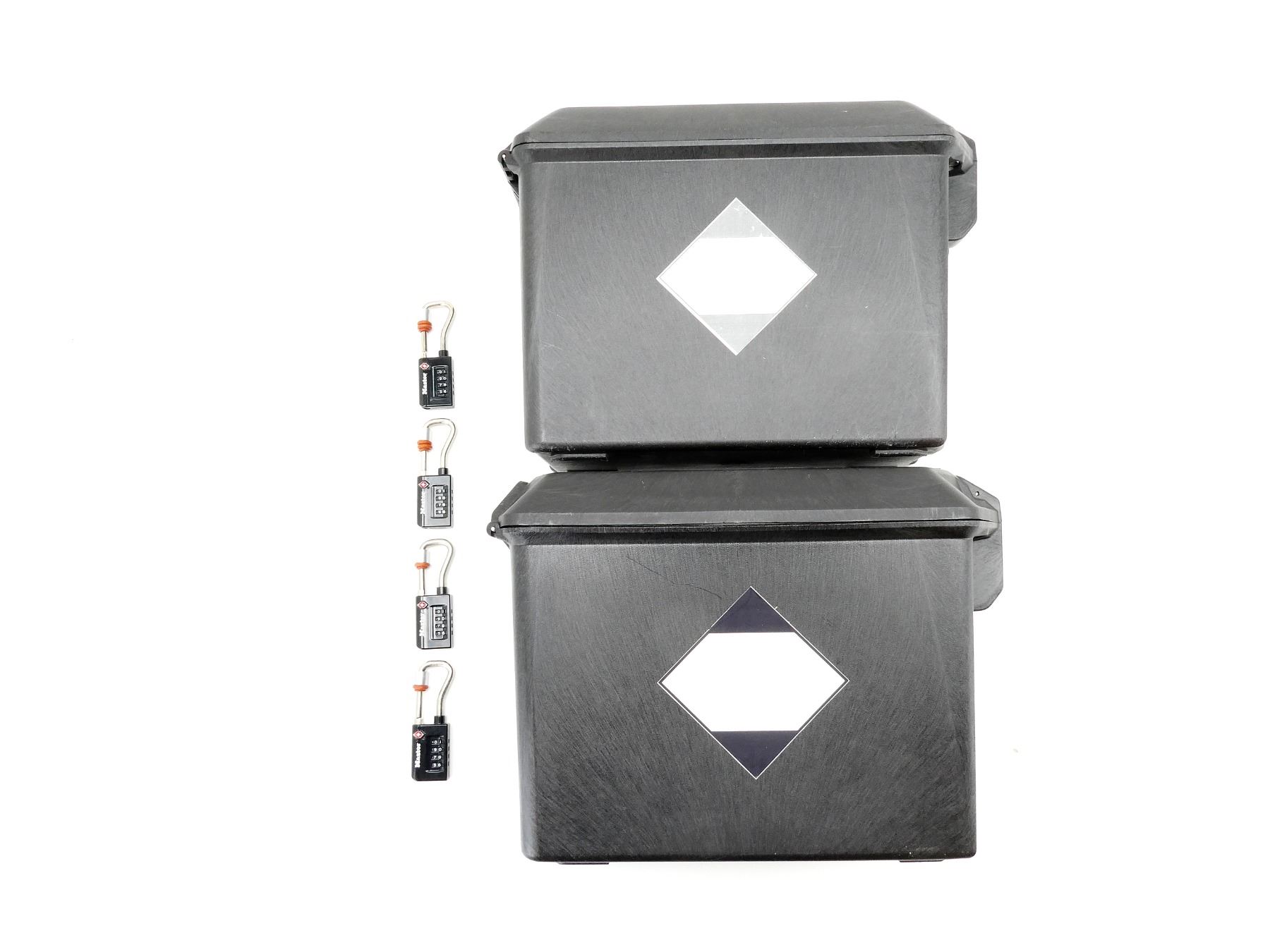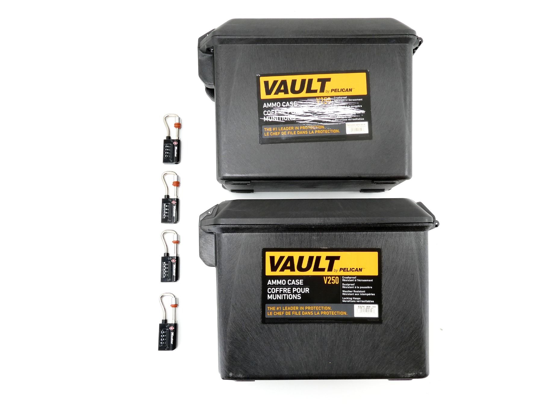 LOT INCLUDES; (2) VAULT BY PELICAN V250 AMMO CASE, HARD BLACK POLYMER CONSTRUCTION, WITH CARRY HANDLE, APPROX. 16" X 8" X 11.75" & (4) MASTER COMBINATION LOCKS. SEE PHOTOS.