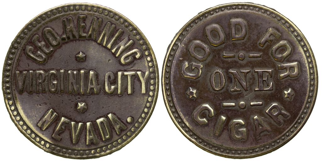 Obv.: Geo. Henning / Virginia City / Nevada; rev.: Good For / One / Cigar. Rd., Br., 30mm, EF, extremely rare.