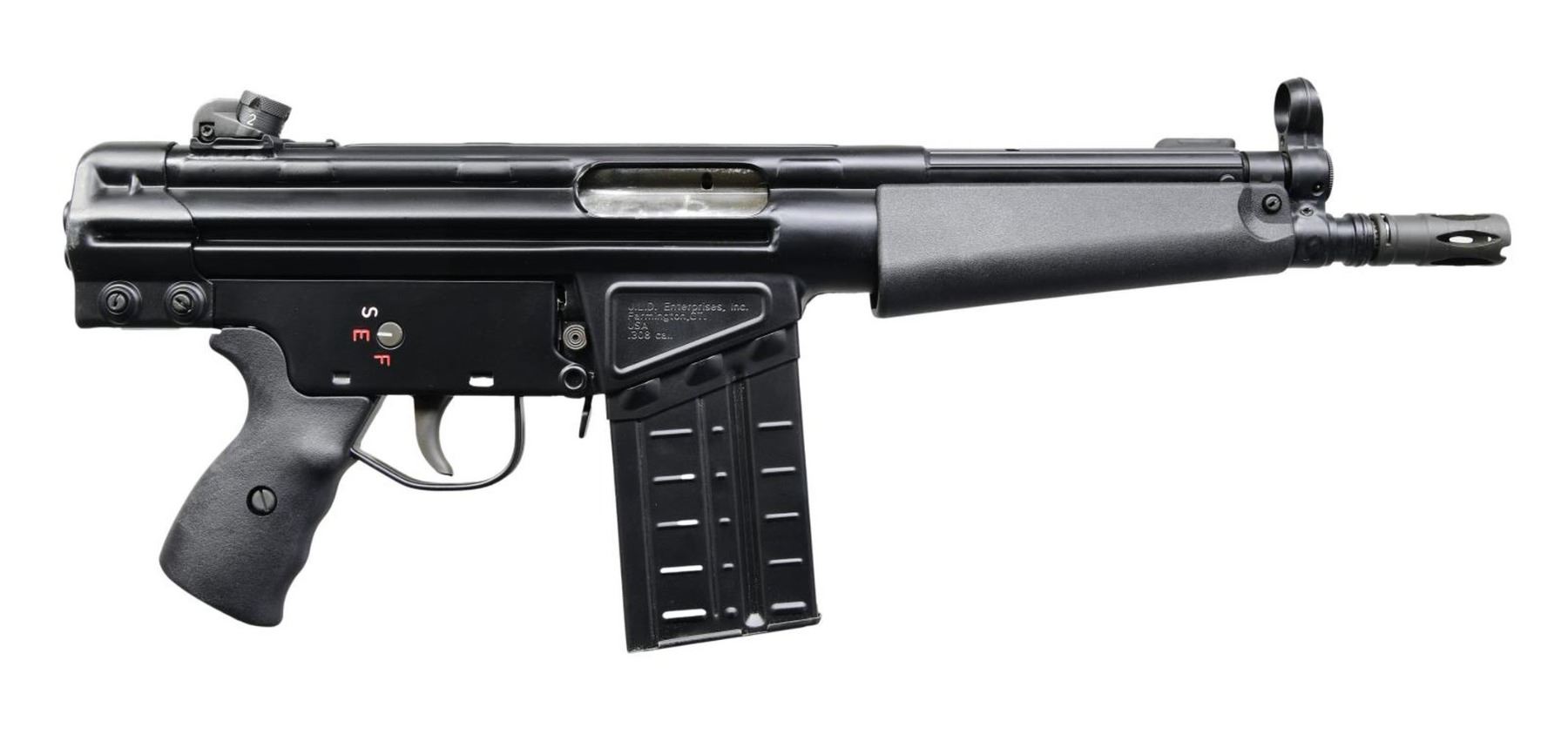 Cal. 308 Win. S# B1065. Bbl. 9" w/ flash hider. HK style sights w/ drum rear. Vector Arms G3 style pistol built on an JLD Enterprises receiver. Matte black finish. Black synthetic pistol grip & forend. Sling swivel present on rear of receiver. MAGS: 1-20 rd. UNATTACHED ACCESSORIES: matching numbered plain white box w/ manual. CONDITION: all aspects near excellent. PROVENANCE: Lifelong Collection of Terrance McCarty. (24-54/MJC). MODERN. $1000-1500.