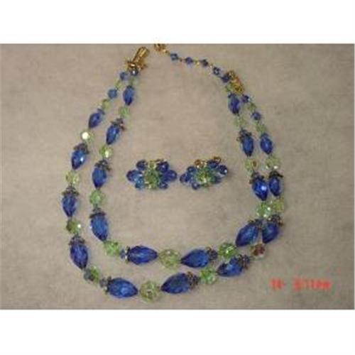 Here is a wonderful!! 1950s SIGNED VENDOME 3 piece necklace and matching earrings set. This 2 strand lovely light green faceted peridot glass beads are alternating with rich deep blue aurora borealis faceted glass stones! There are spacers that consist of light green peridot colored rhinestones on each brass spacer! What a beautiful piece of fine costume jewelry work! The earrings are clipped and screwback style. Excellent condition. This 2 strand necklace measures 17 1/2 inches and is an adjustible chain with blue faceted aurora borealis crystal glass stones. This could be worn more as a choker or a necklace!