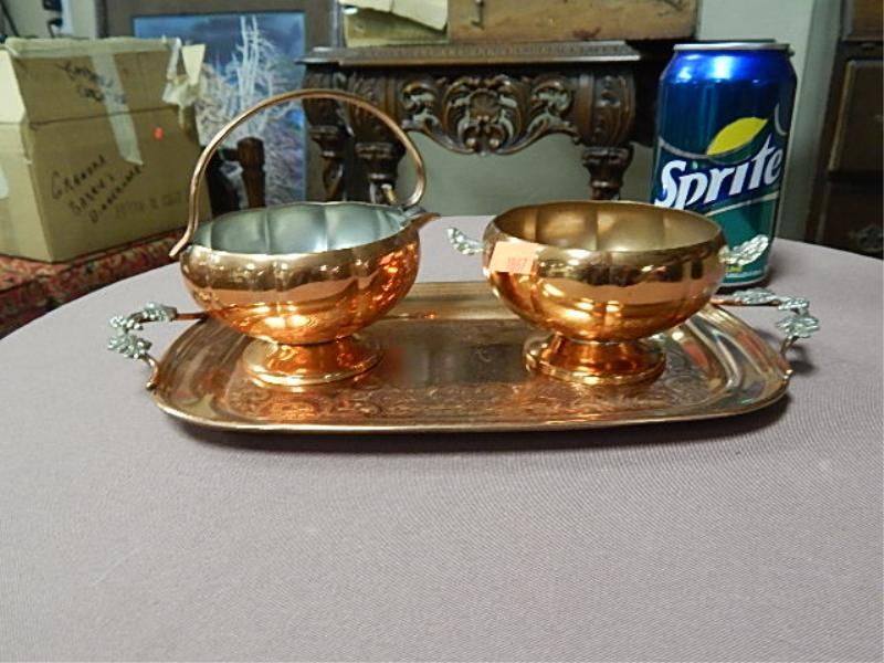 VENETIAN COPPER CREAM AND SUGAR SET WITH TRAY - CANADA MADE
