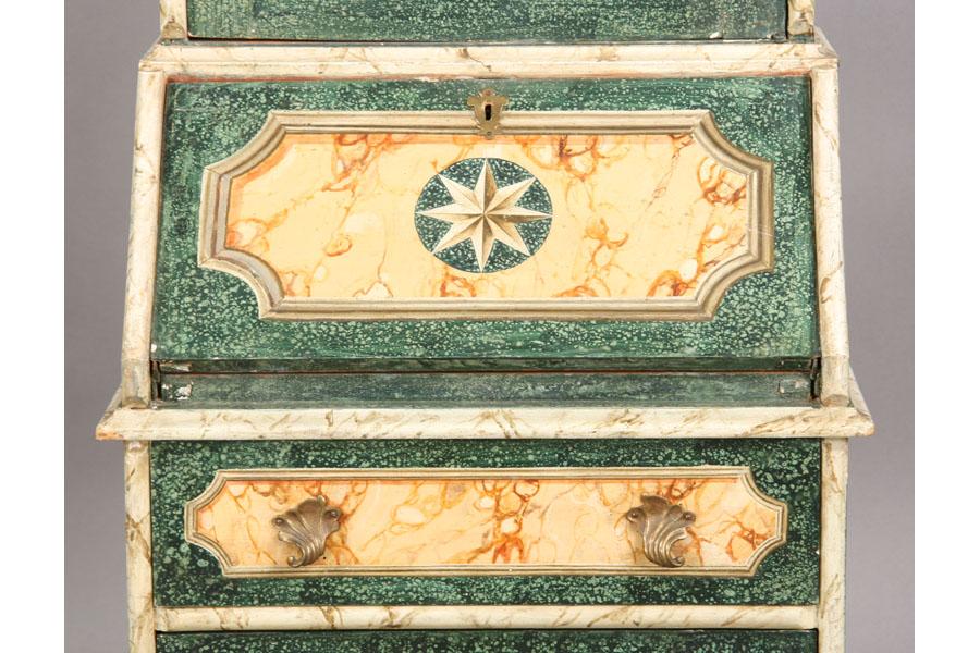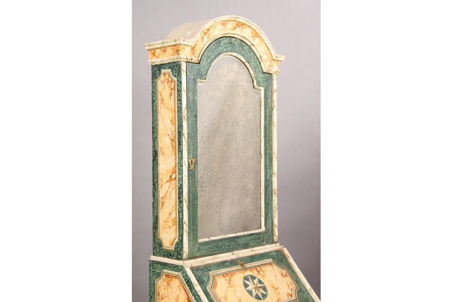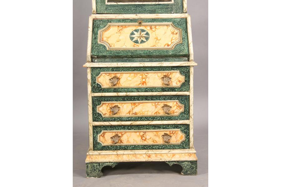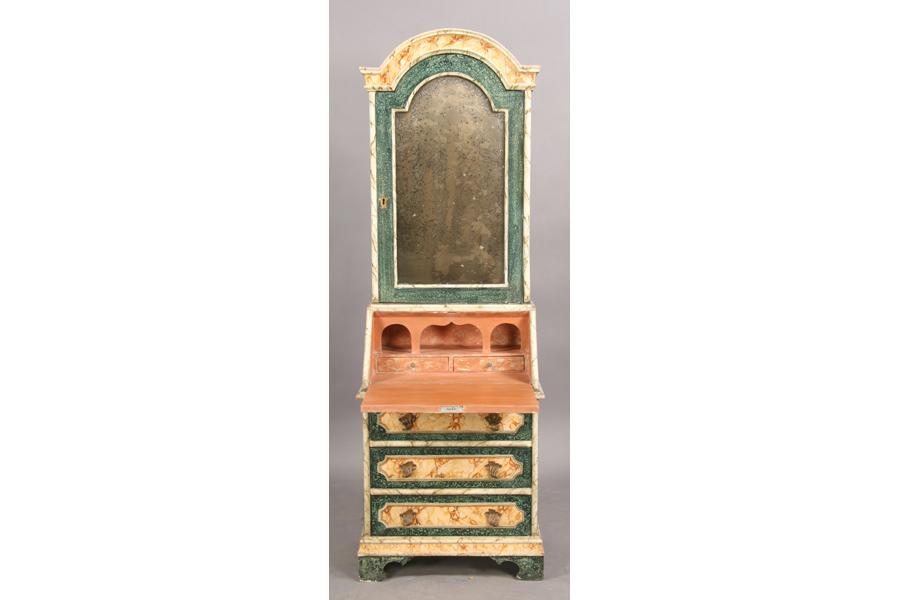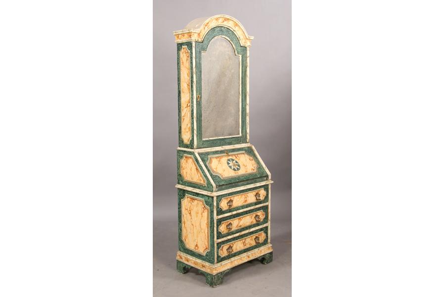Good Venetian faux marbleized secretary with arched top over distressed mirrored panel circa 1940. Having a slant front base over thre drawers, raised on bracket feet. Ht: 72.5" Width: 24" Depth: 15.75" ***PLEASE NOTE: All property shall be paid for by the purchaser within five (5) business days of the sale. Kamelot Auctions accepts cash (In house only), personal checks, certified checks and money orders. We do not accept credit cards or Paypal under any circumstances. Please note our policy regarding payments from International buyers: The only acceptable method of payment is a bank wire/bank transfer. For invoices more than $1000, there is no additional fee for this service. For invoices less than $1000, please include an additional $25 wire fee. We will be happy to forward our bank wiring information after the completion of the auction. Thank you for your understanding and cooperation. All purchases must be removed within 15 business days after an auction. Property not removed from our facility after 15 business days will be moved to an off-site storage facility at a charge of $10.00 per day payable by the buyer. Kamelot does NOT provide shipping services or estimates. However, we recommend the following independent shipping services: Antique Transport Co. at antiquetransport@cs.com, Farren Transport at farrentransport@comcast.net or All Points Shipping at jb@allpointsshippingnj.com for quotations and shipping arrangements for furniture and other large items that would require a blanket wrap shipping company. For quotations and shipping arrangements for smaller items that would traditionally be shipped through UPS, please contact The UPS Store at store4744@theupsstore.com or The Packaging Store at hrpa112@aol.com. Clients are welcome to pick up their items from our location or make their own shipping arrangements.