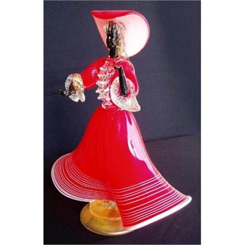 Stunning free-blown glass figure of a female Dancer. Her dress and hat are composed of triple cased glass (clear over brilliant red over white). The skirt is threaded with lattimo glass, applied black face and hands, clear gold speckled fringes, hair and round domed pedestal. Mint condition, no chips, cracks or repairs. Dimension : 10" H. Attributed to Barovier and Toso, circa 1940-50's.