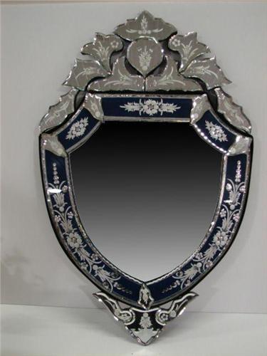 VENETIAN GLASS MIRROR. Shield form. Blue and floral decorated at border. 19” x 30.25”