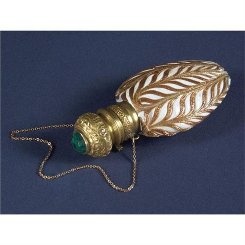 SCENT BOTTLE: A Venetian glass scent bottle with ormolu snap lid, gold chain, faceted green glass finial stone, 3'', copper and white feathered design, missing interior stopper, circa 1880's per consignor.