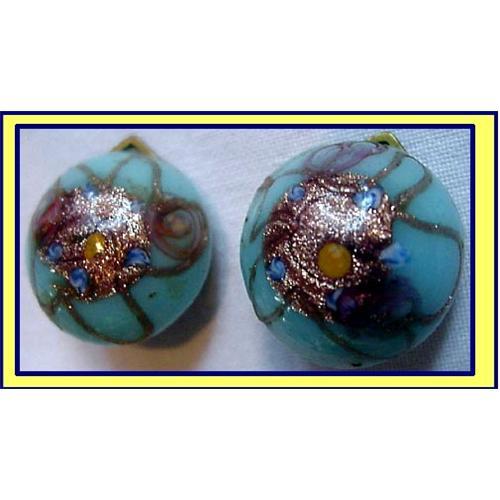 Venetian / Murano handmade glass clip-on earrings. Circa 1940's. Vintage Venetian glass, Italy.<BR>Diameter is 7/8inch.<BR>Round, domed earrings in beautiful soft blue. Real gold fired into the glass in swirling patterns. Clip on earrings marked on the back: MADE ITALY.<BR>Excellent condition - no chips/cracks/damage of any sort. <BR>Please see other items from this collection (including matching necklace).